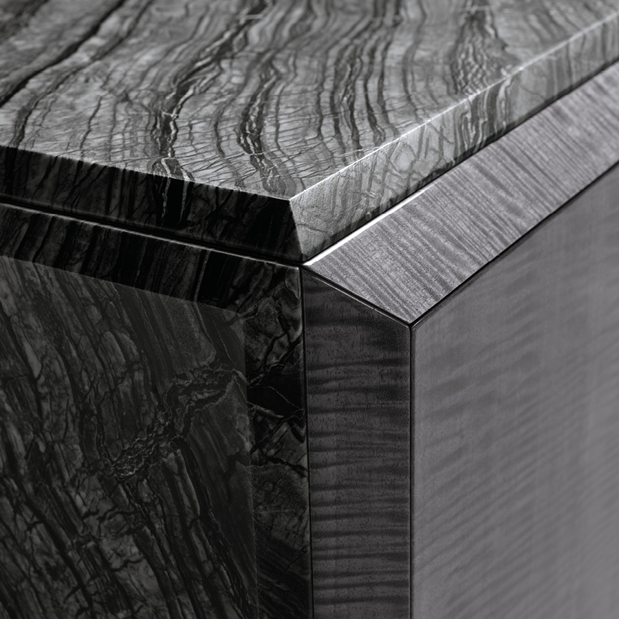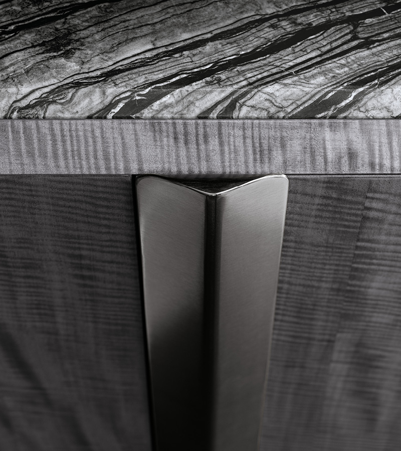 Buffet with 4 doors in Madagascar fìgured Mowinghi veneer with high gloss polyester finish. Top and sides in Kenya Black marble. Base and handles in satin black nickel stainless steel. 1 interior full extension drawer with front in Madagascar figured Mowinghi veneer with high gloss polyester finish, bottom part in velvet fabric. 3 adjustable glass shelves.