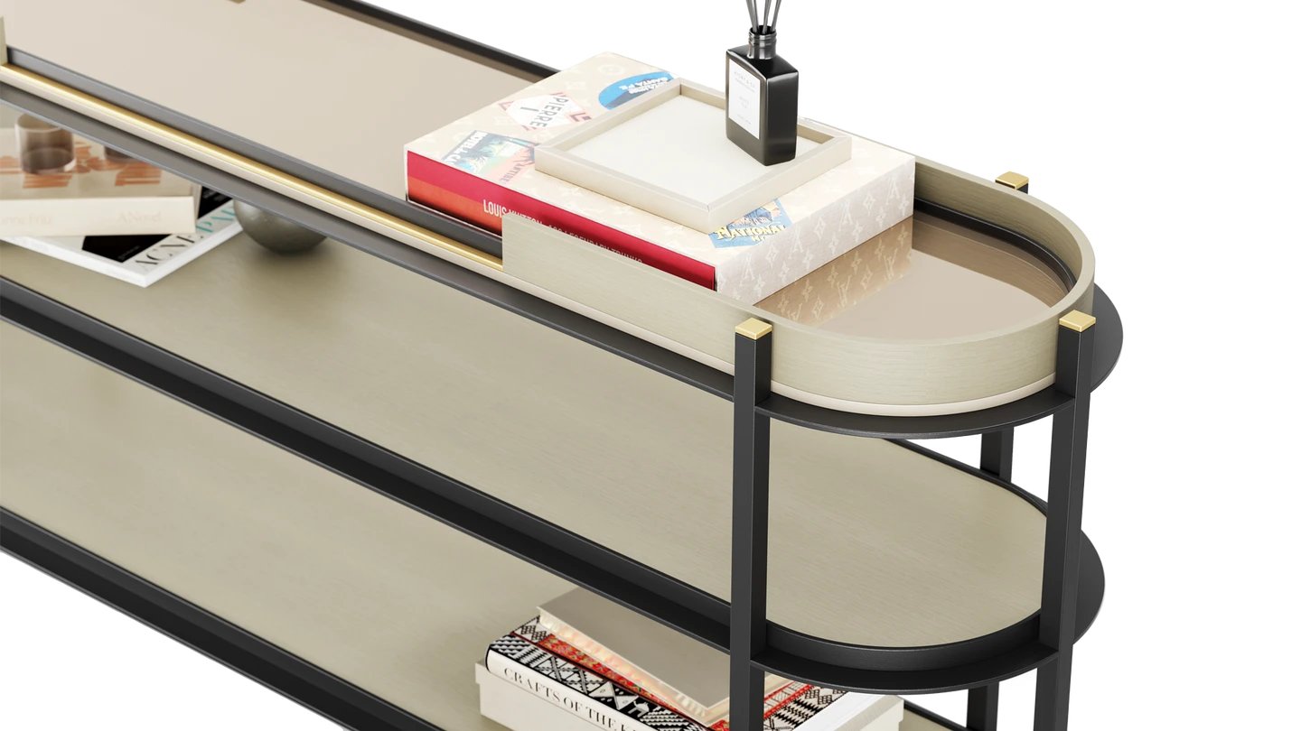 "Taking inspiration from the rocky desert town, our SEDONA Console commands space with its iron and wood base. Bronze mirror and brushed brass give it a subtle glow. "