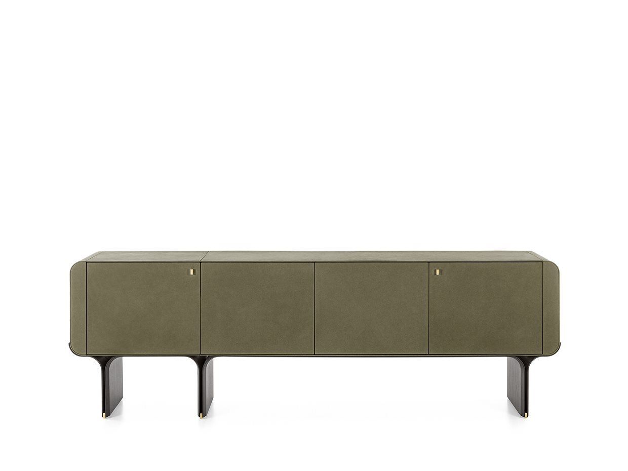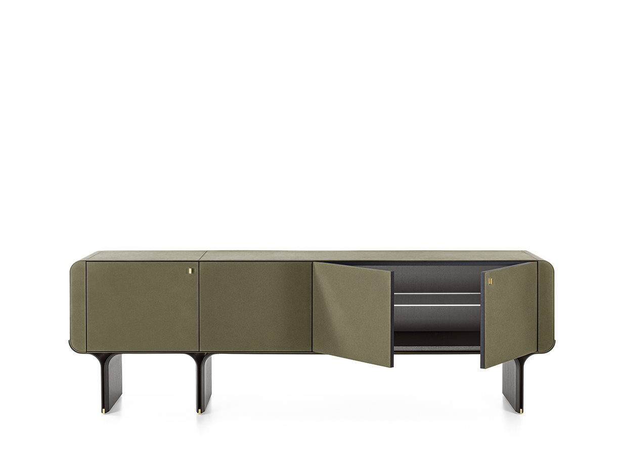 Madia con base in frassino curvato tinto nero poro aperto e dettagli in ottone lucido. Contenitore in legno rivestito in pelle fard nei colori del campionario. Dotata di ripiano interno in cristallo extralight 10mm temperato.