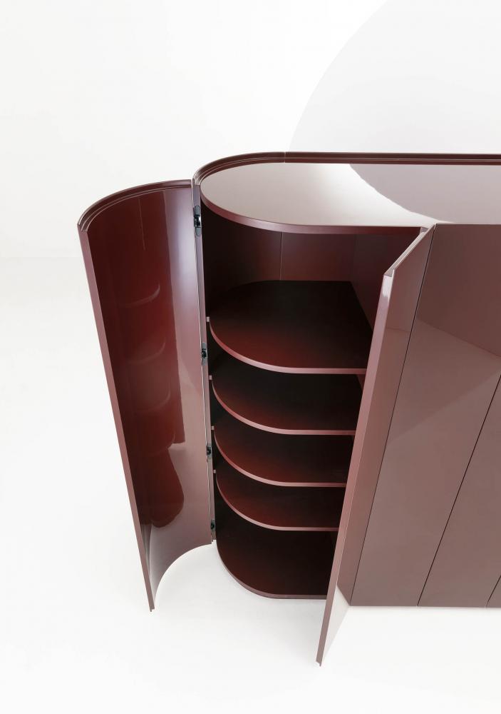 Storage unit in plain, dyed or lacquered wood with 6 hinged doors and curved sides. Equipped with internal shelves and drawers.