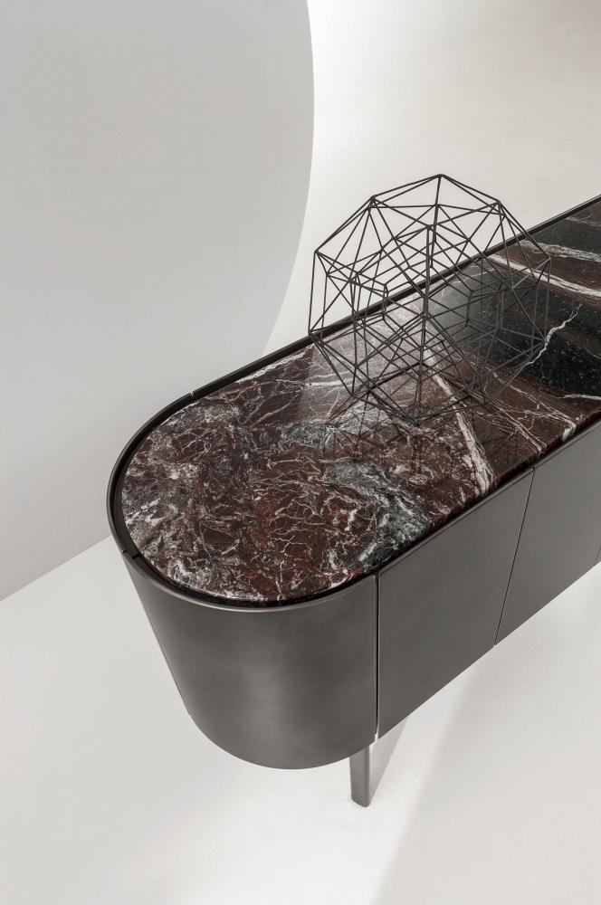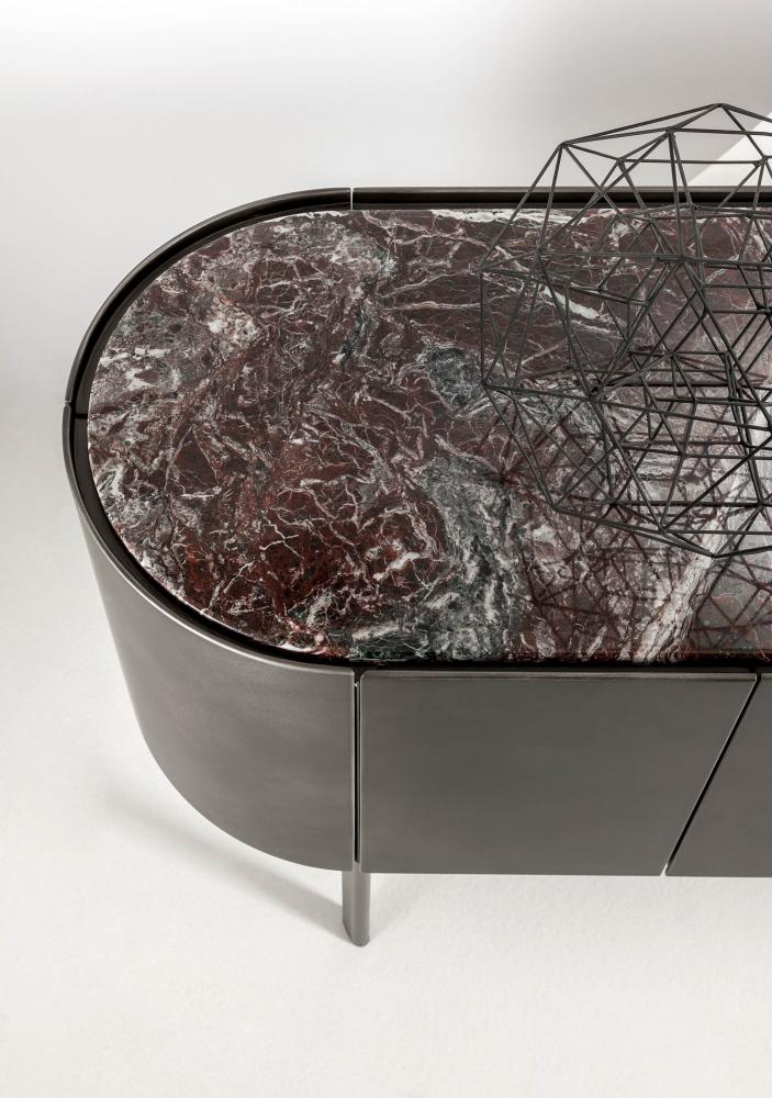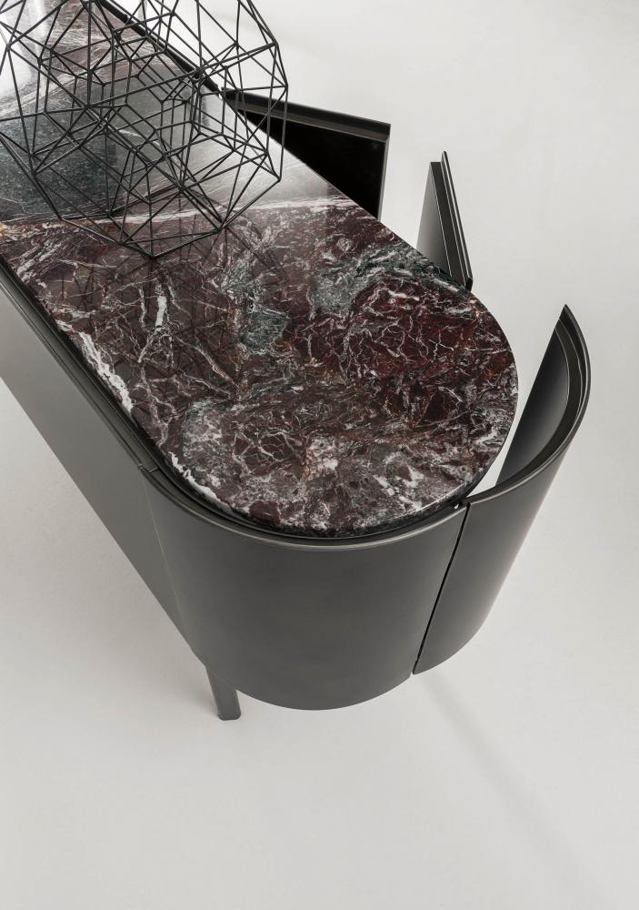Inspired by the iconic Collectionist unit, this new sideboard proposes its soft and curvilinear design to create a low version, decorated with particular metal legs.