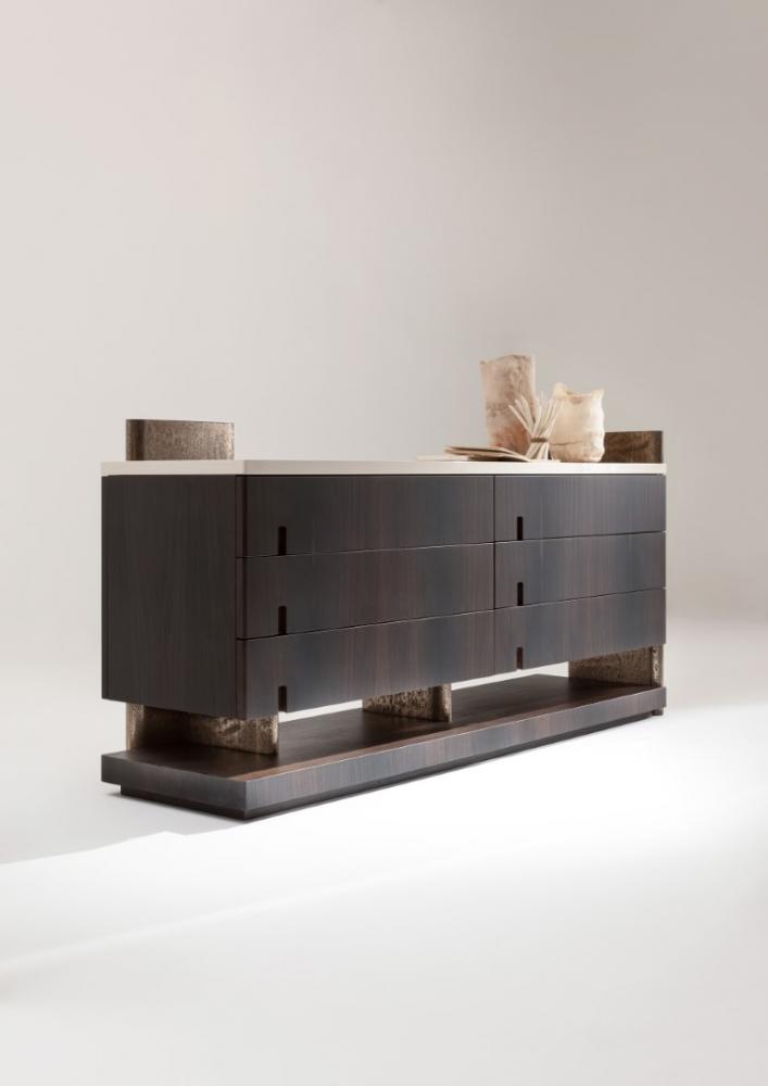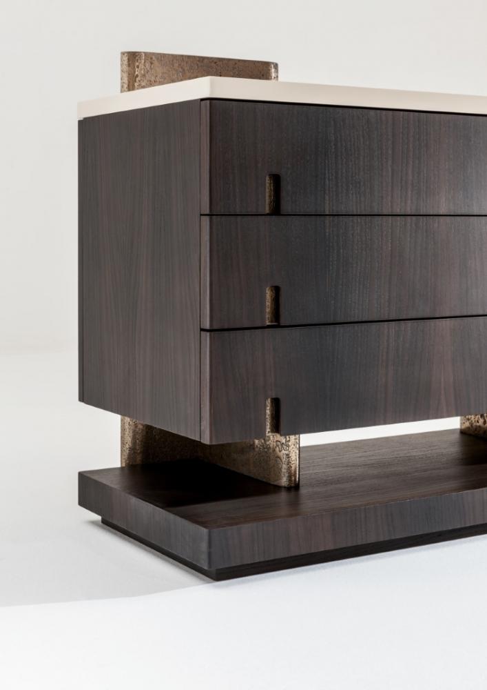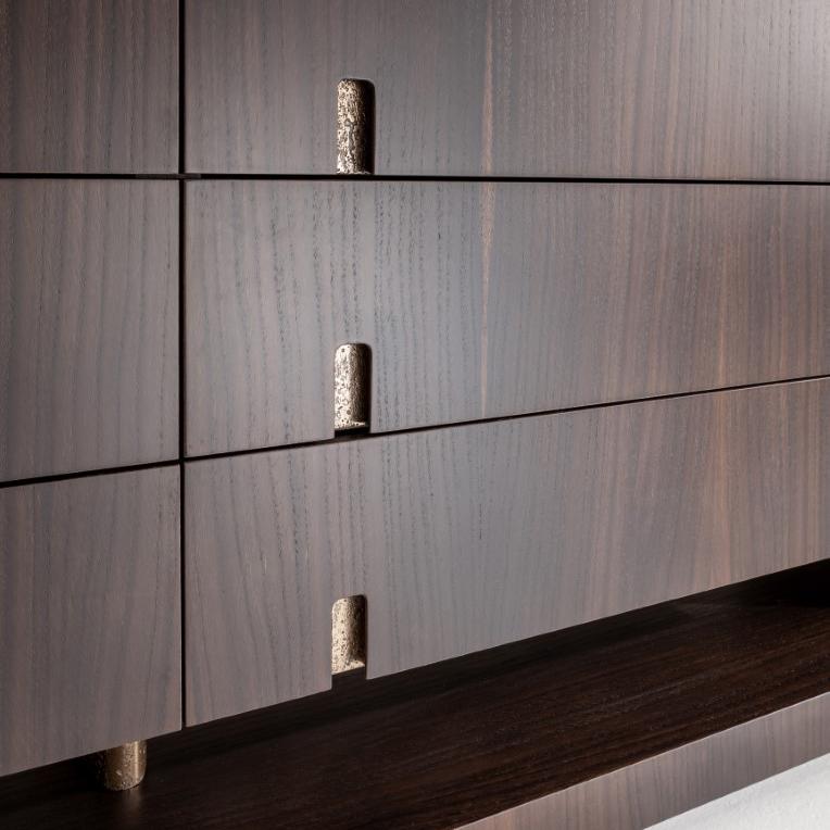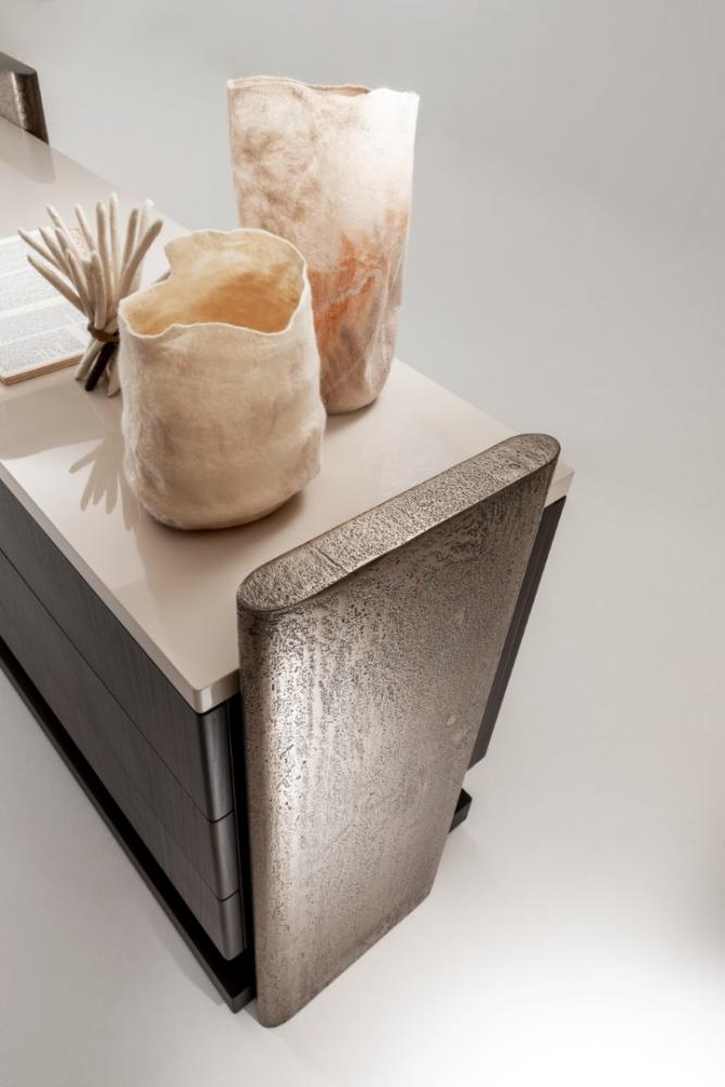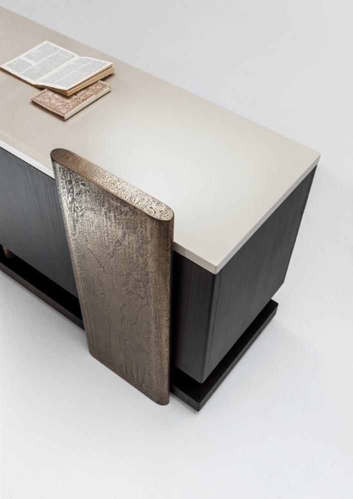 結(jié)構(gòu)采用該系列的所有木材、苯胺染色橡木或所有 RAL 顏色的拉絲啞光漆。側(cè)面、背面和手柄均采用古色“金”漆和液態(tài)金屬材質(zhì)。