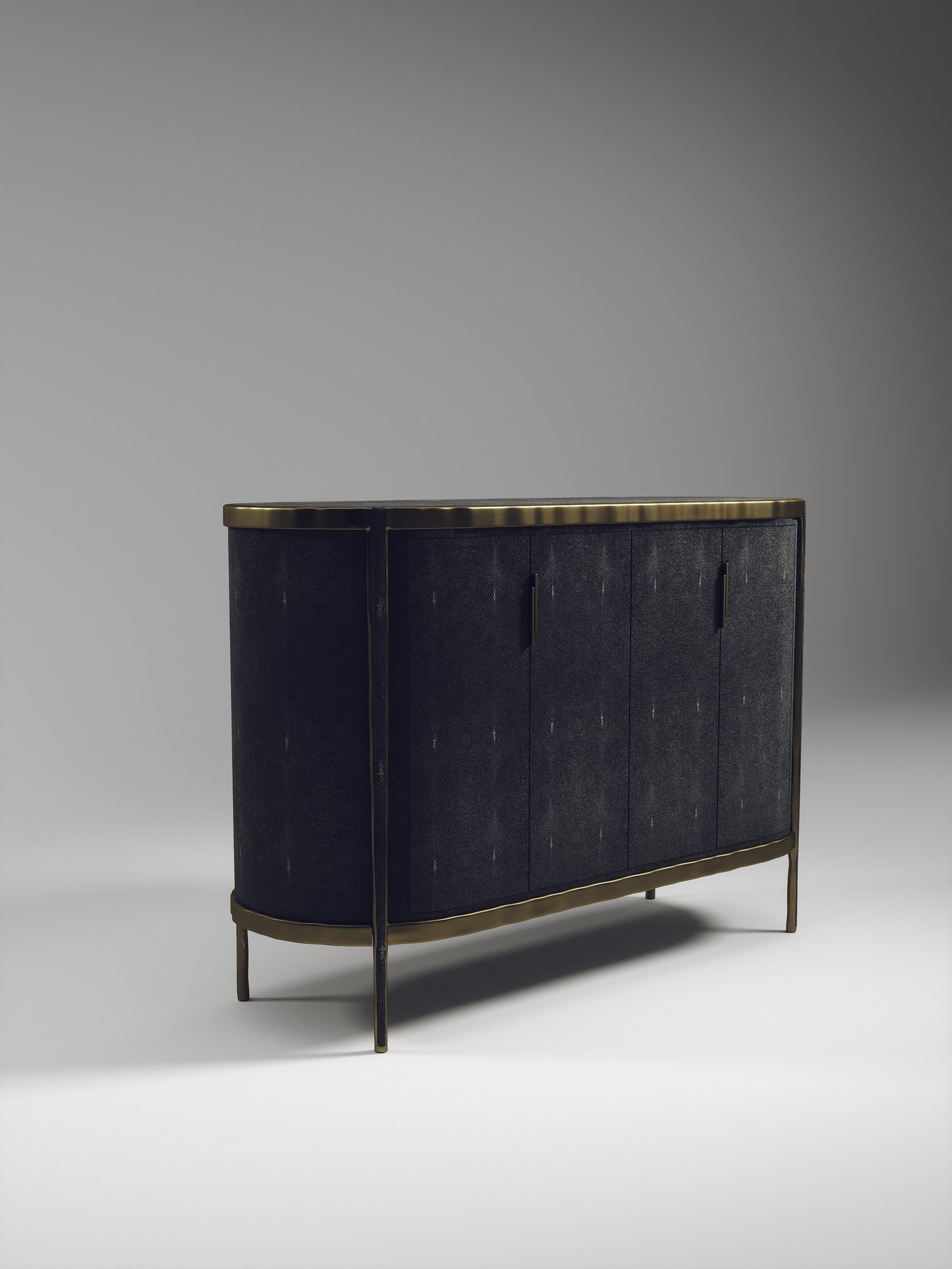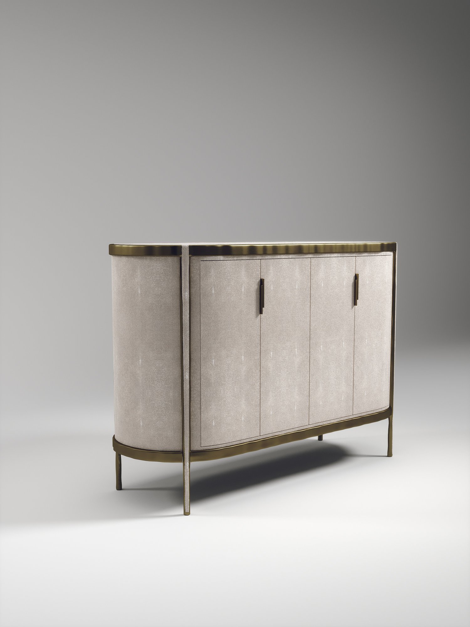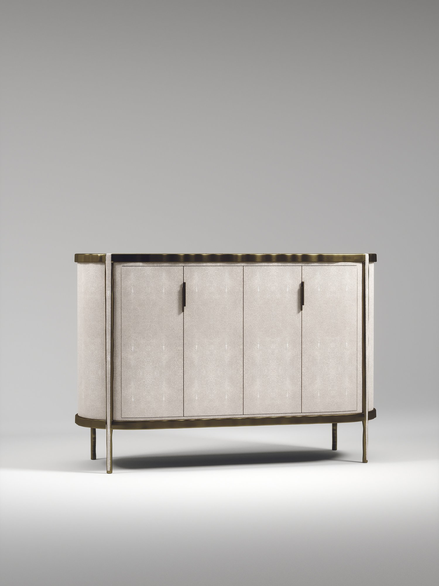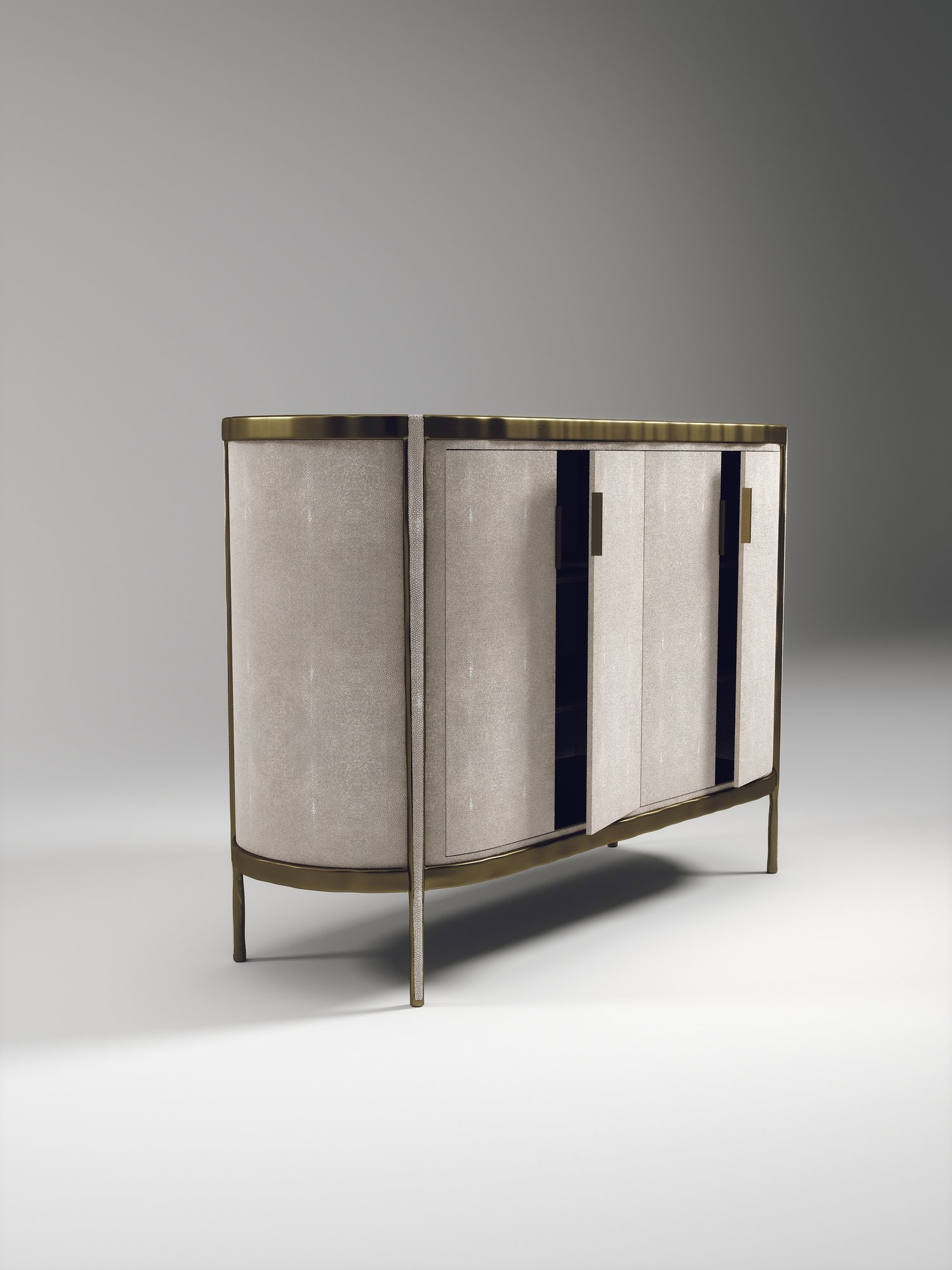 The Melting Buffet by R&Y Augousti is an elegant piece for any space. The cream shagreen inlaid piece is classic, but accentuated by their signature organic melting bronze-patina brass frame. This credenza includes 4 doors that opens up to 3 shelves. This piece is part of the Melting Capsule. Available in other finishes.