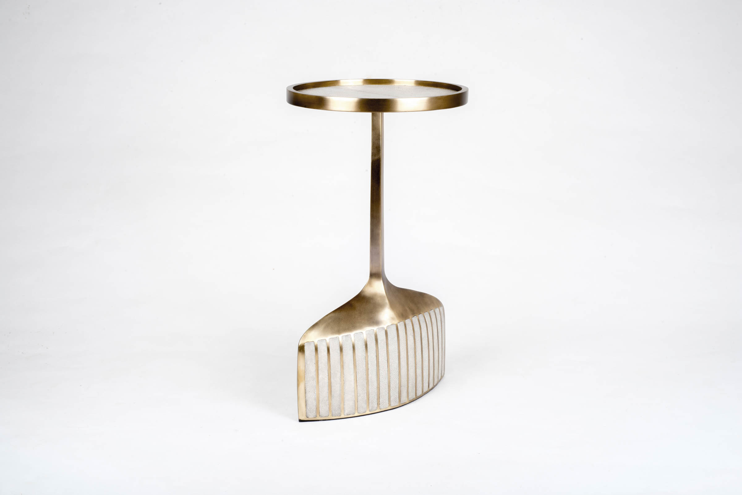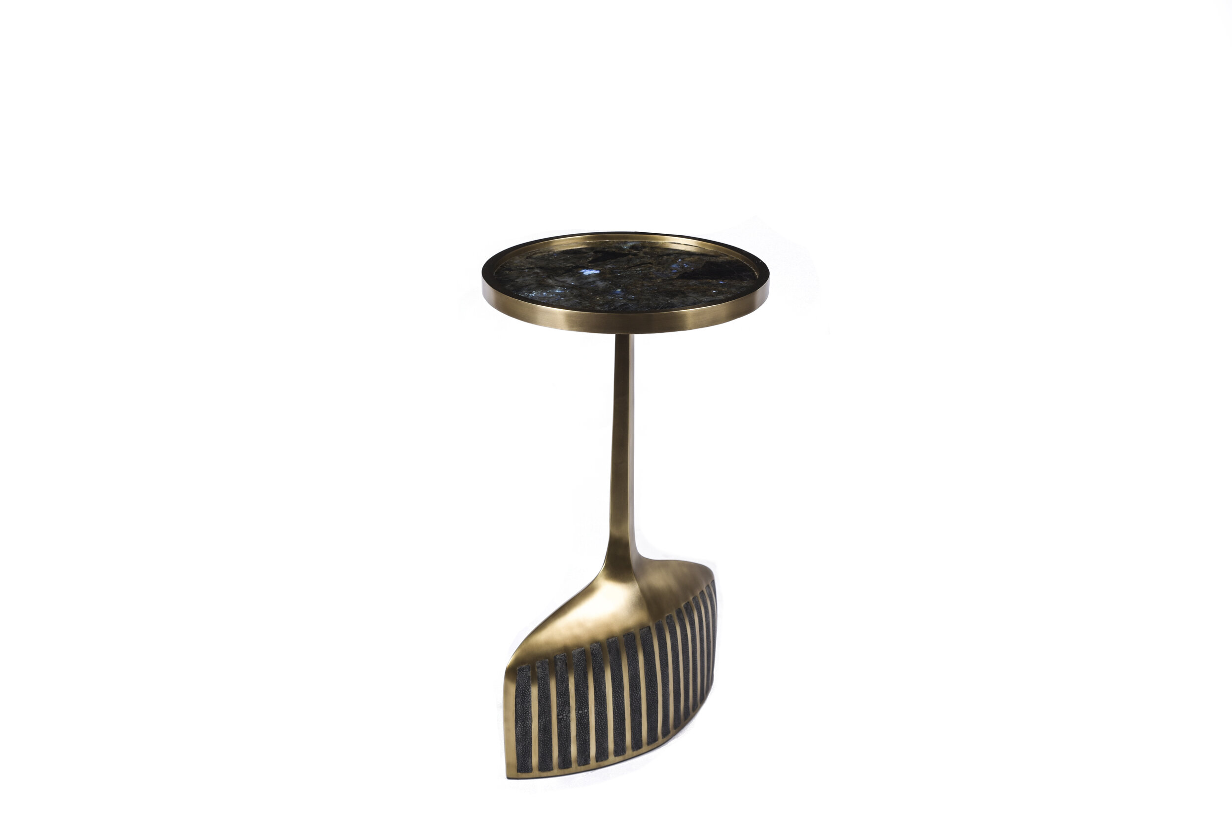 The pedestal side table in small and large are the perfect nesting accent pieces due to their sleek and light aesthetic. The large size is inlaid on the top surface with coal black shagreen, the bottom part a mixture of blue pen shell and bronze patina brass. The small size is inlaid on the top surface with Lemurian and the bottom part a mixture of black shagreen and bronze patina brass. The option to purchase the tables as individuals is available upon request.