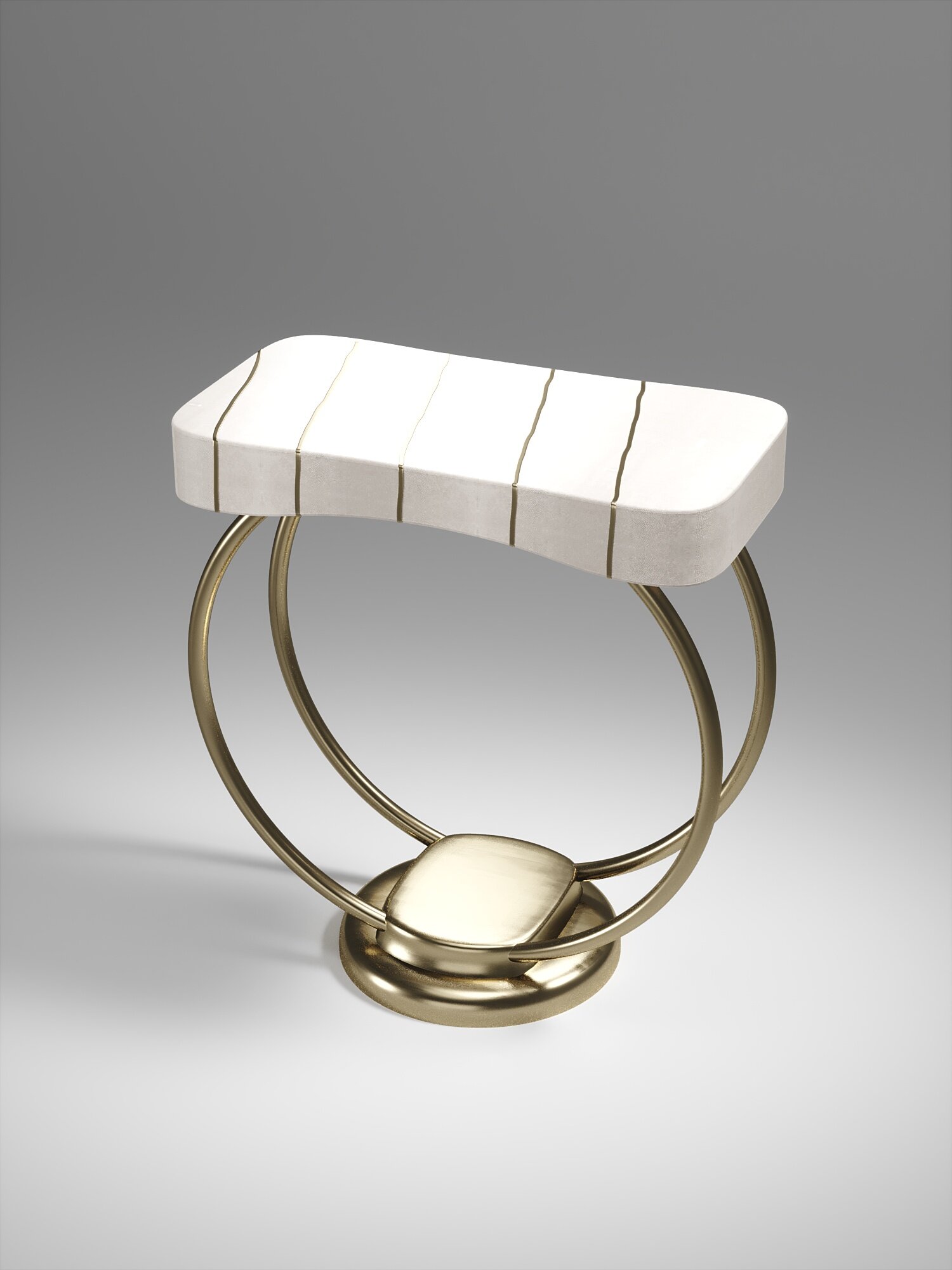 The Melting Ring side table by R&Y Augousti inlaid in cream shagreen is an elegant and sculptural piece for your home. The rectangle top has the iconic melting pattern of Augousti that is slightly in relief from the shagreen surface, and sits on the jewelry-inspired bronze-patina brass structure.