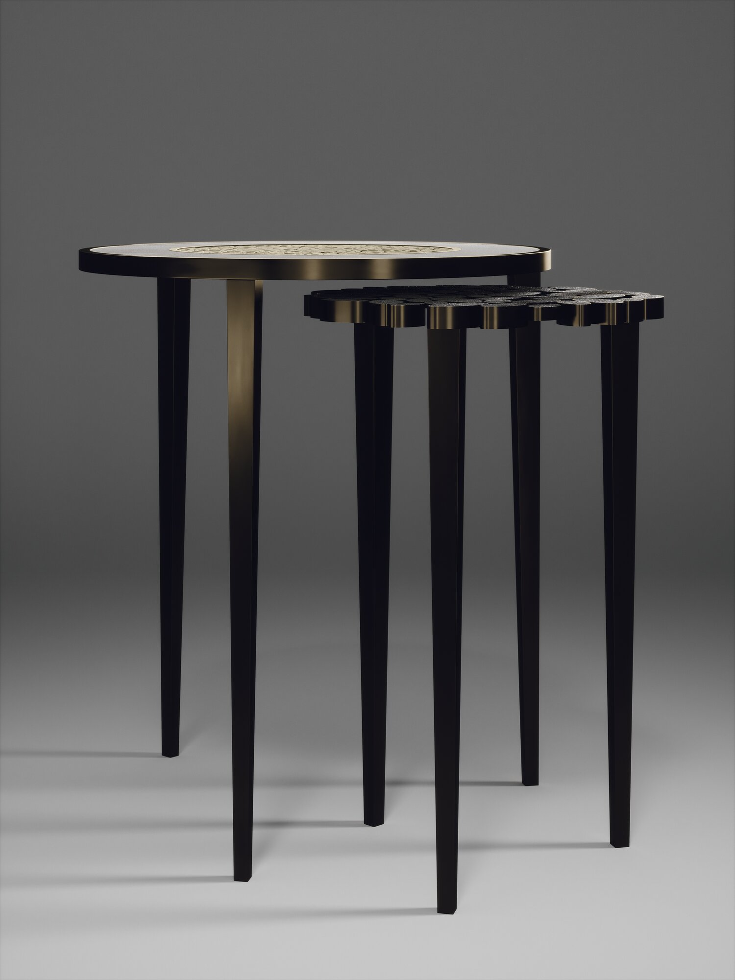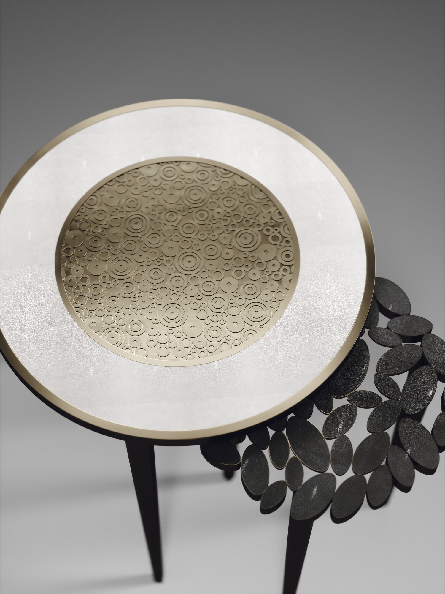 The iconic nesting tables by R&Y Augousti, showcase their signature and renowned artisanal work. The larger nesting table is inlaid in a mixture of cream shagreen and dark bronze-patina brass, and the smaller in a mixture of black shagreen and dark-bronze patina brass. The circle inlay pattern seen on the center top of the larger nesting table is an iconic Augousti pattern originating from their first collections in 1990. Each circle is handcut and then hammered by hand onto the shagreen table.