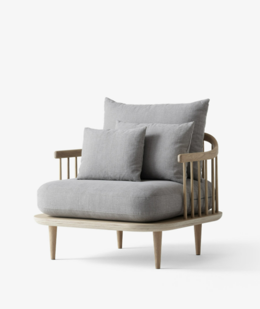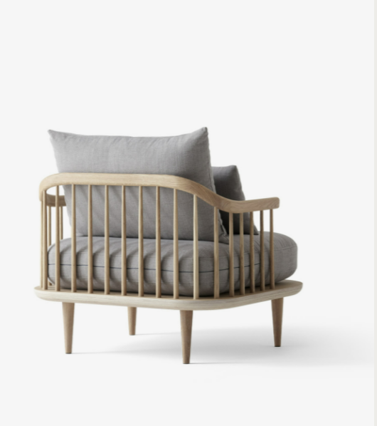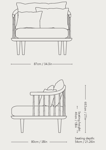 Veneer sheets formpressed together towards a solid wood insert. Milled into shape and lacquered. Natural Rattan weaved around a powder coated stainless steel frame.