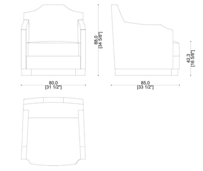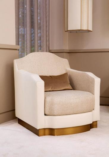 Inspired by the Palladian style, it has a rigid structure upholstered in fabric and slender wooden feet. Jacquard woven fabric upholstery on the seat complete this elegant armchair.