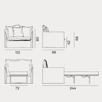 La famiglia di divani-letto Ghost unisce funzionalità, comfort ed estetica. Disponibili nella versione poltrona-letto e divano-letto in più dimensioni, i divani trasformabili Ghost si sviluppano attorno ad una leggera scocca dai volumi essenziali. La caratteristica principale dei divano-letto Ghost è il rivestimento sfoderabile, una housse oversize il cui profilo è sottolineato dalle cuciture a vista, che permette ai prodotti di svestirsi e rivestirsi in un baleno. Si tratta di un progetto tessile che cambia facilmente volto, permettendo di passare da un look elegante ad uno informale con facilità e velocità.
