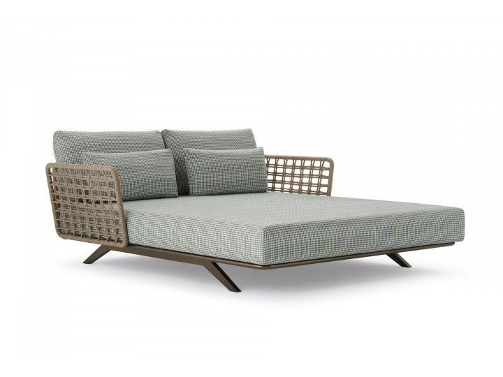 Daybed in acciaio inox Aisi 304 ed alluminio, verniciato a polveri ed intrecciato in Oval Trendyrope. Linee che valorizzano l'iconico stile italiano, dove le lavorazioni in corda donano un'estetica materica ed artigianale alla morbidezza avvolgente delle sedute, per concepire uno spazio ideale, dedicato al relax e alla socializzazione. Progettato sia per l'arredamento residenziale che contract, outdoor e indoor.