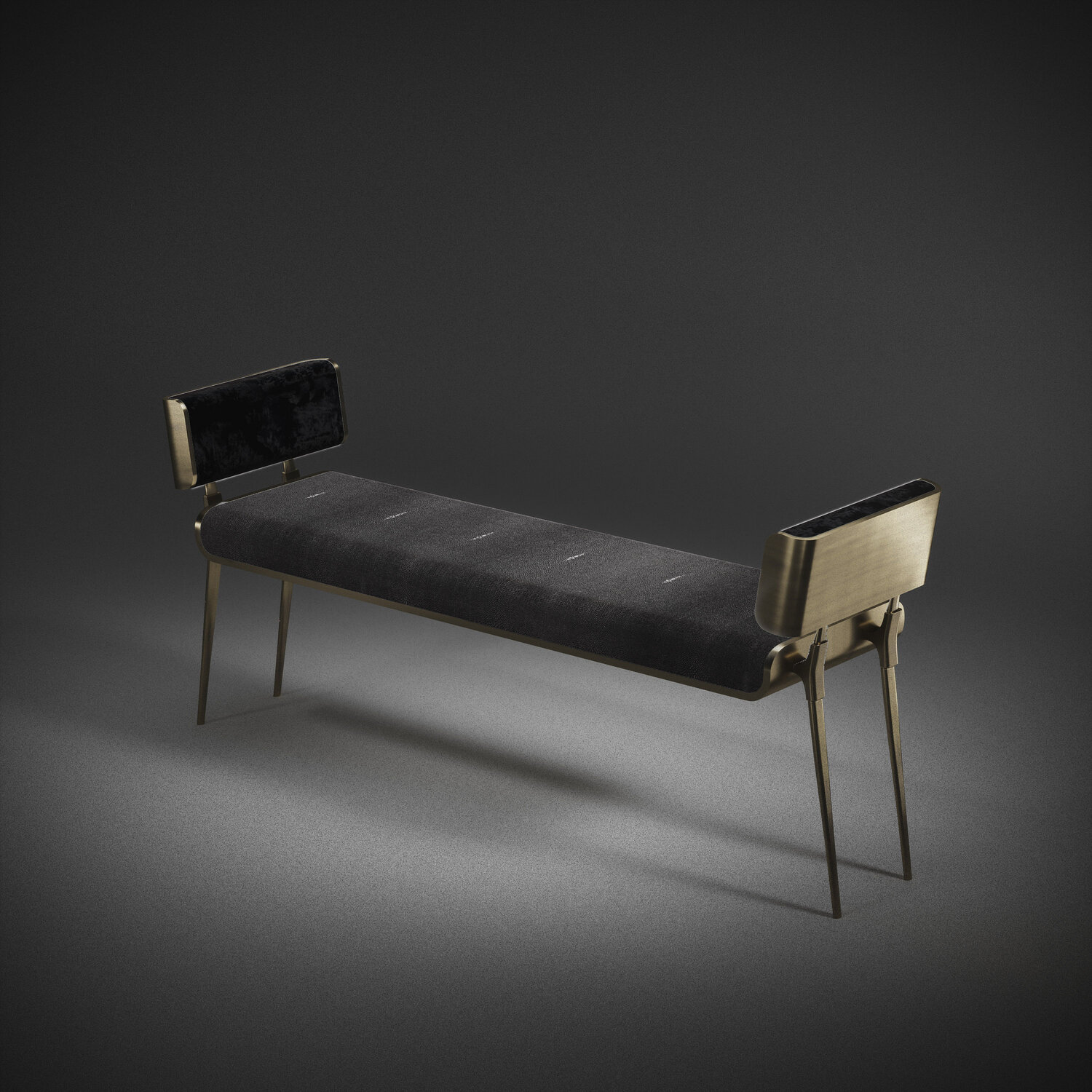 Inspired by the original Dandy bench by Kifu Paris, the Dandy II Entrance Bench is the ultimate luxury seating. The seating area is inlaid in cream shagreen and the frame, legs and sides of the bench are completely inlaid in bronze-patina brass. On the left and right side of the bench both armrests are in upholstered with white vachette.