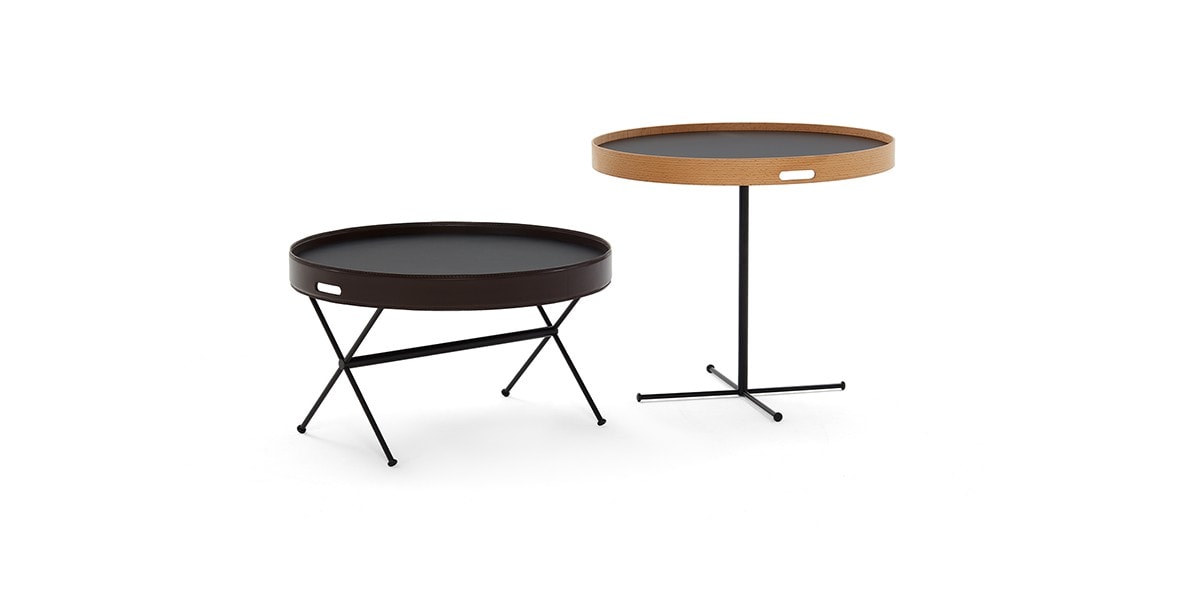 Delicate in its balances, Chab-Table Leather is sewn onto the material. Supported by a minimal structure in black-painted steel, its circular top is a tray covered in pigmented leather with visible stitching. A tribute to the 20 years of collaboration with Nendo, it embodies all the essential forms and moves in the combination of black – for the top or the edge – with taupe, natural leather, or brown.