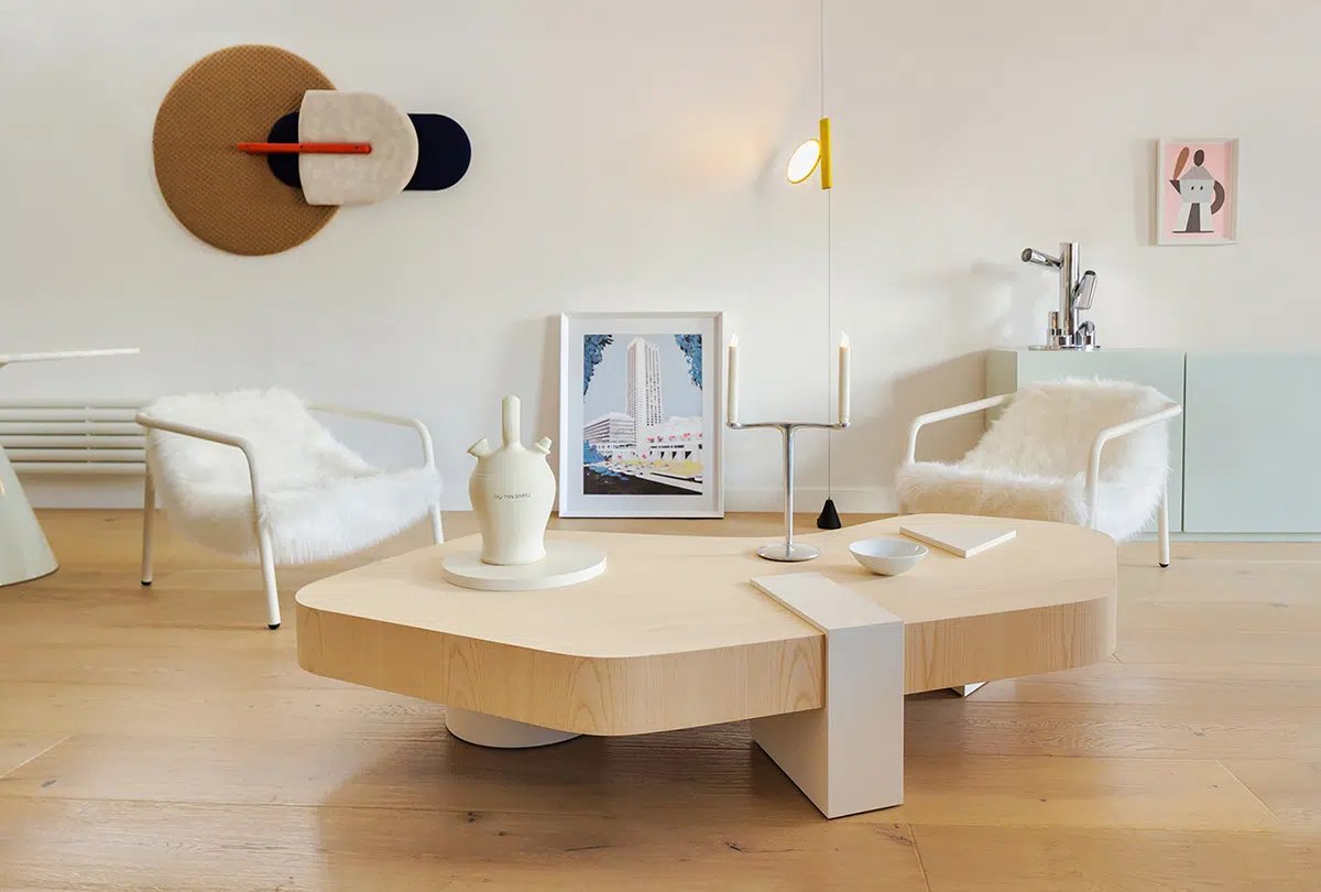 On the one hand, the new coffee table is smaller in size and retains its asymmetrical top with geometric rectangle and circle bases. Like its predecessor, it is available in the 4 carefully curated finishes: monocolour high gloss or extra matte lacquer, stained ash wood top and lacquered bases or the iconic Designer’s Edition with the sophisticated Sottssas Grey veneer by Alpi with lacquered bases.