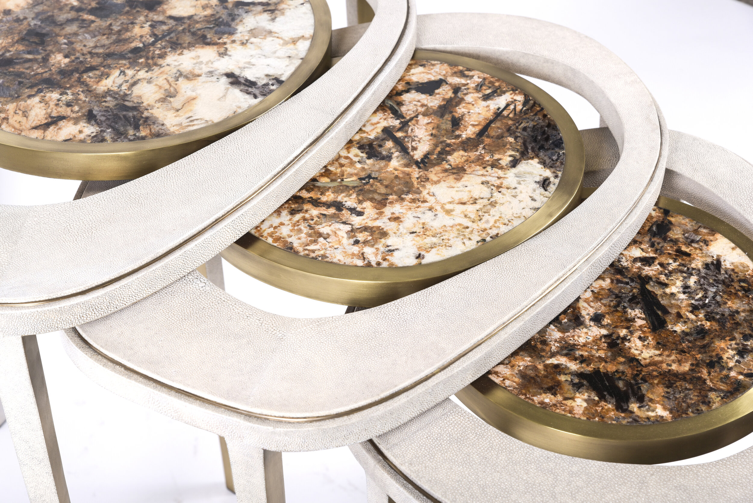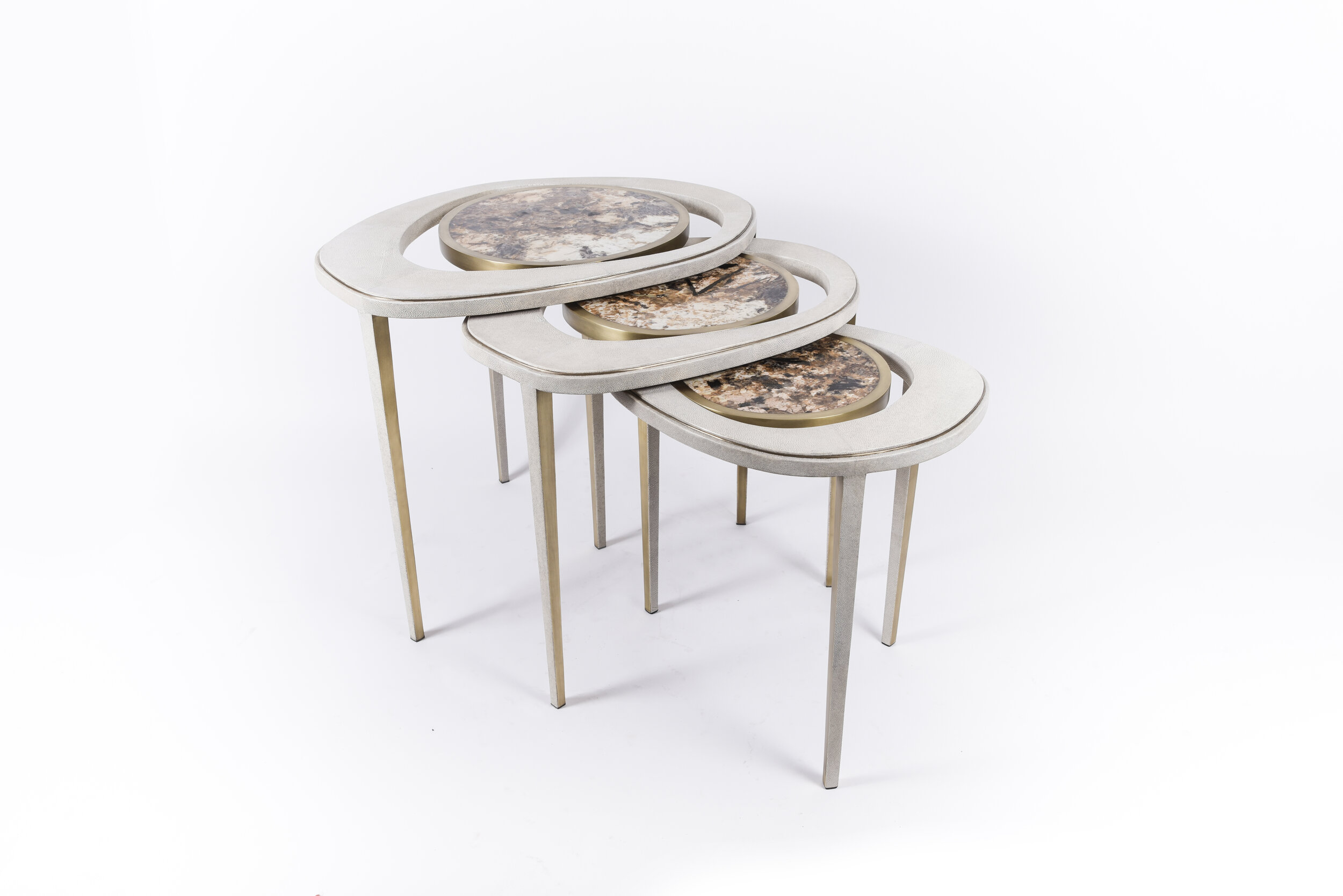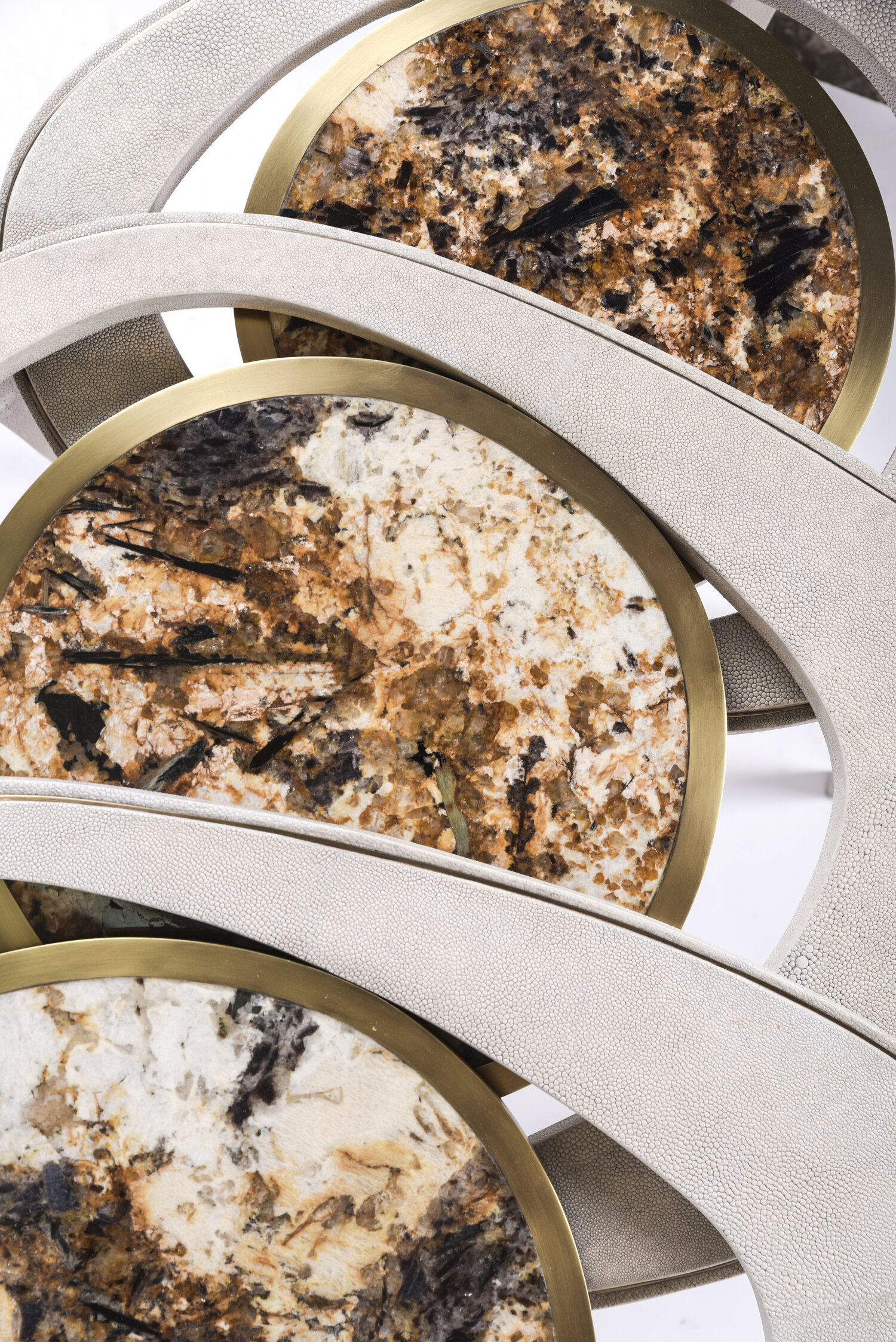 The set of 3 peacock nesting side tables are an iconic R&Y Augousti piece and one of their first designs. The piece is Minimalist and sculptural, with inspiration of course from the shape of exotic peacock feathers. All 3 pieces are inlaid in a mixture of cream shagreen, Hwana stone and bronze-patina brass. The option to purchase a single table and not as a set is available upon request.