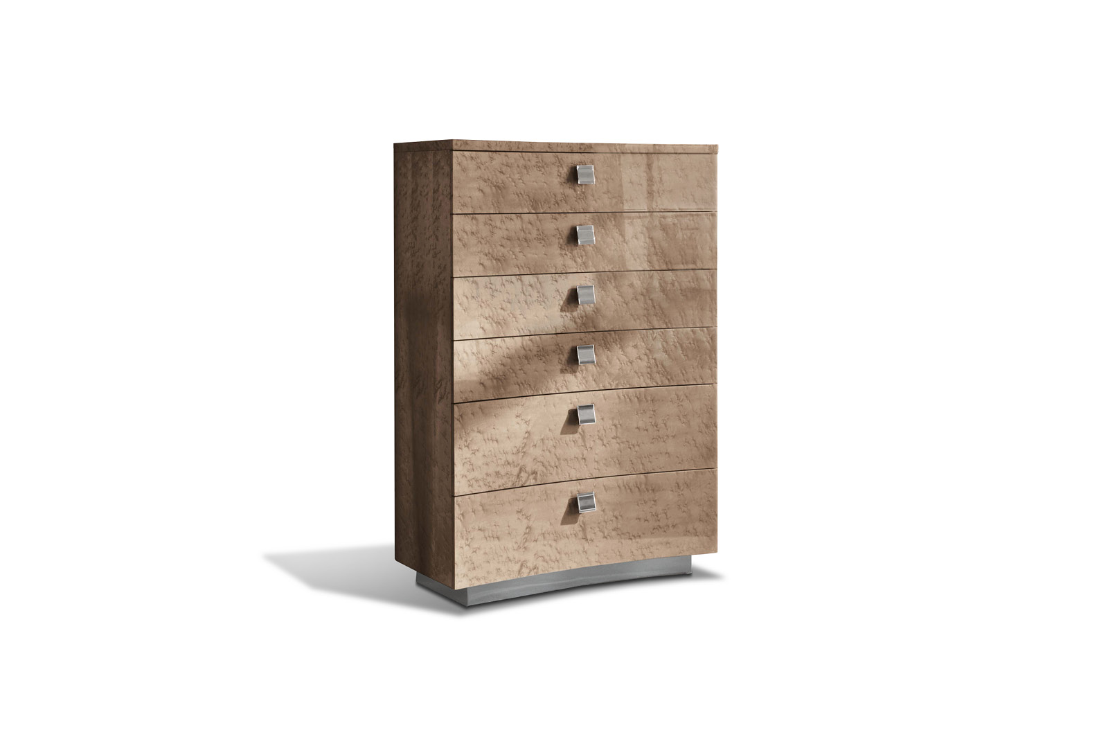 Chest available in high gloss polyester champagne bird’s eye maple veneer. Chrome stainless steel handles and base.
