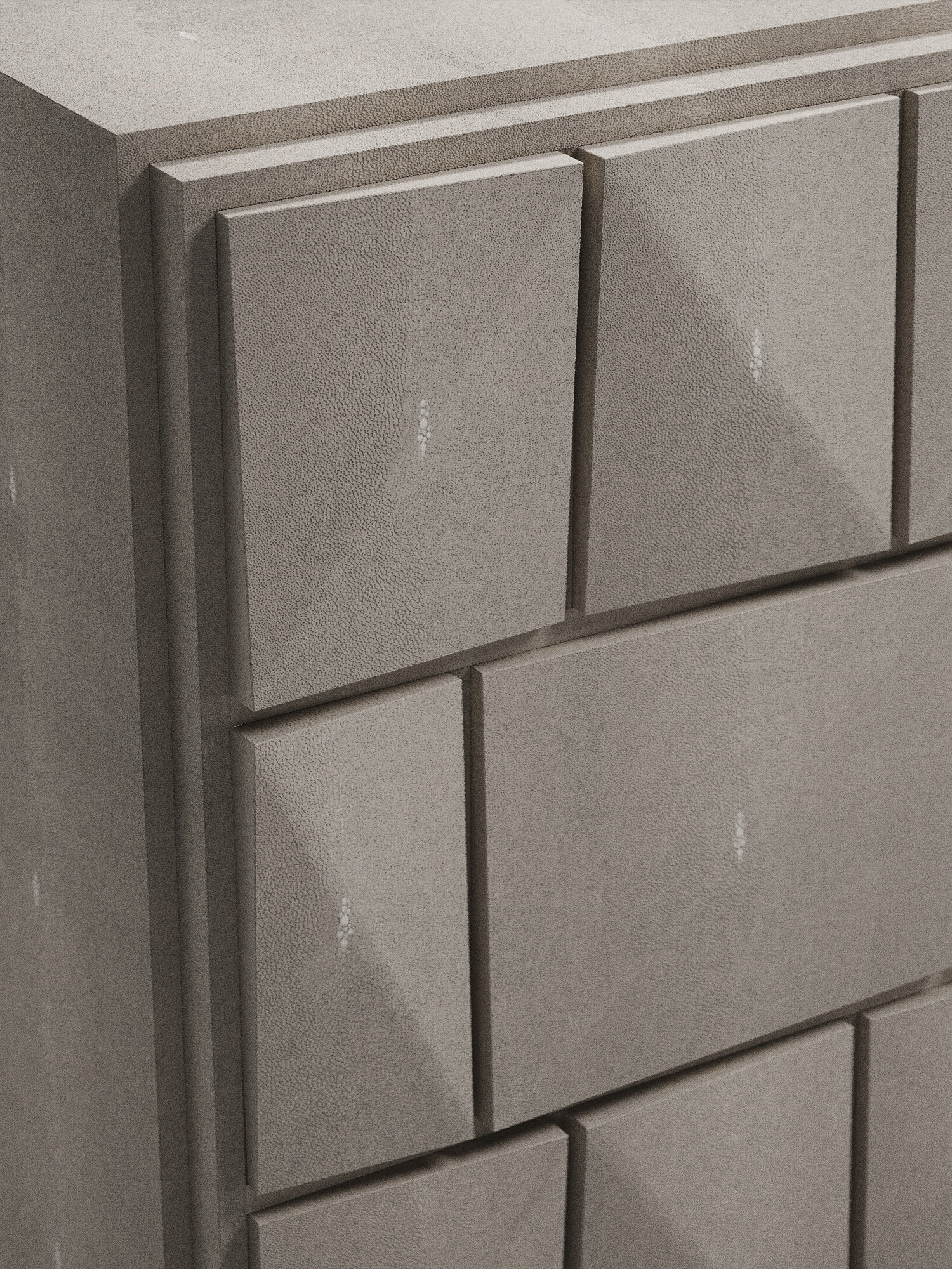 The Rhomboid chest of drawers in cream shagreen is a beautifully detailed piece with its dramatic beveled "rhomboid" drawers. This storage cabinet includes 3 drawers total. Available in other finishes, see images at end of slide. The finish of the shagreen is authentic as it is hand-dyed and the designer calls the finish look: "antique natural shagreen."