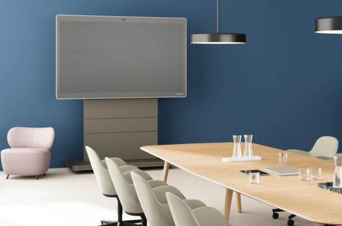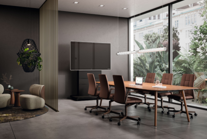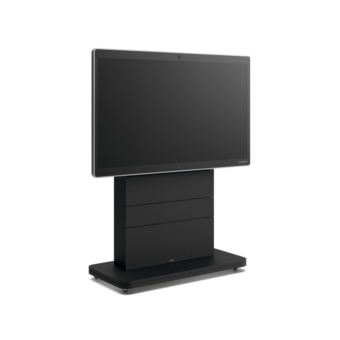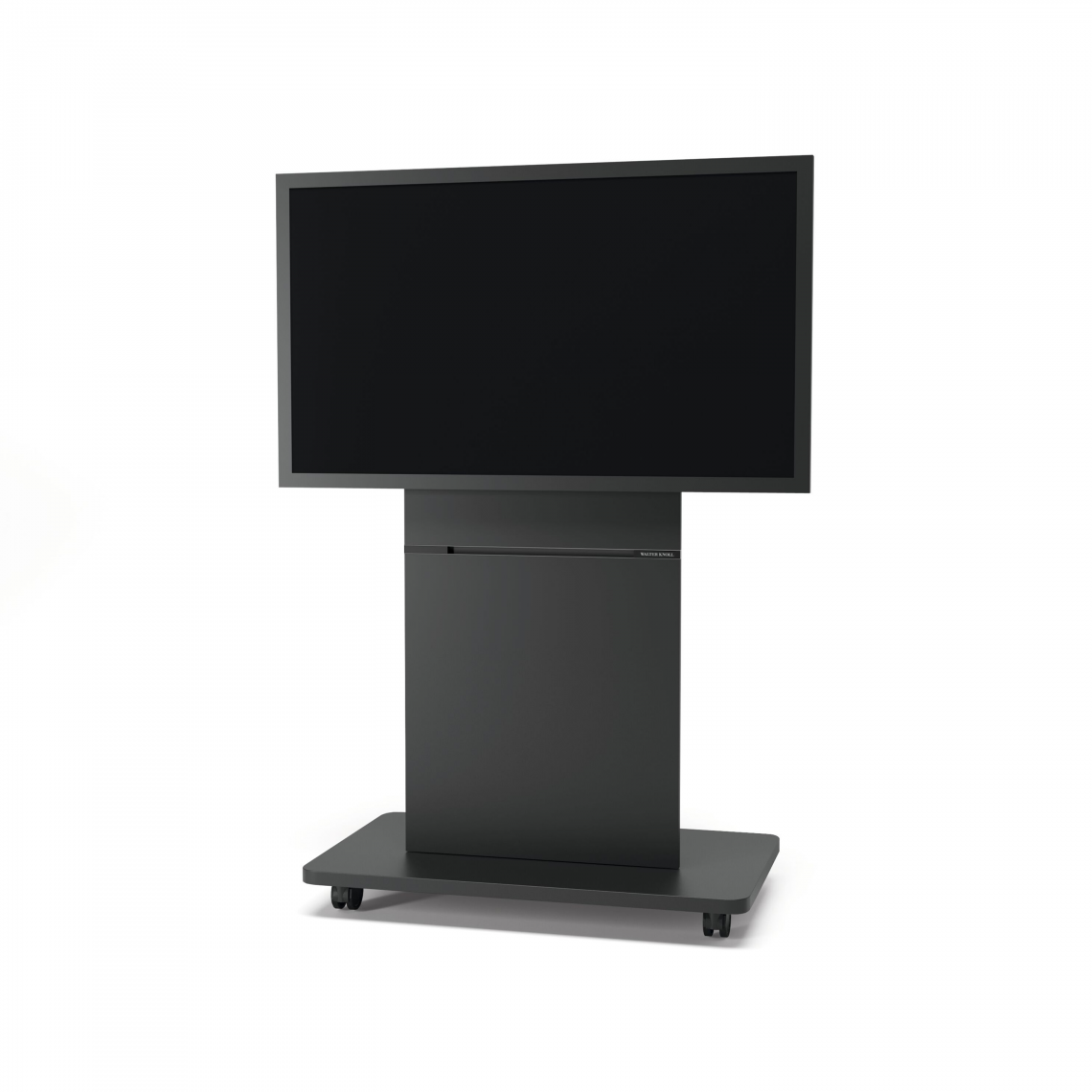This movable, freestanding media stand is compatible with screens from different brands, measuring up to 85 inches. Through an opening in the back, the technology is freely accessible and lockable at all times, and the height of the screen can also be adjusted.