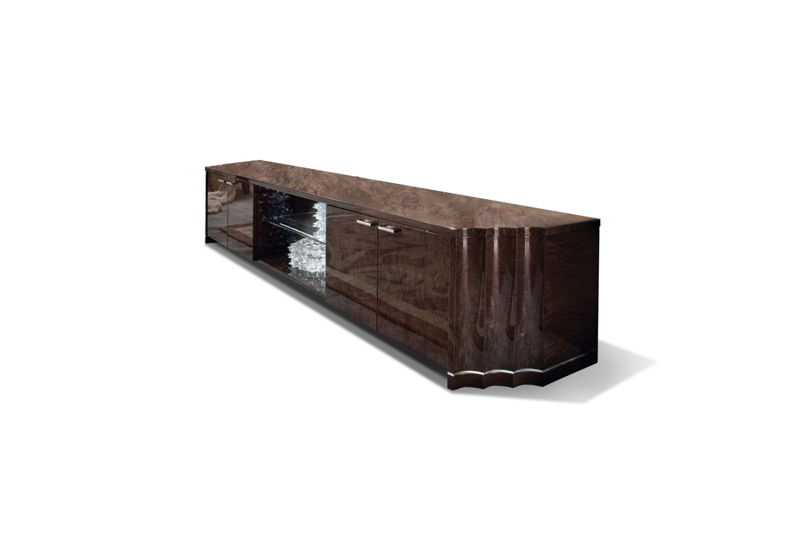 Base for T.V. unit in moka japanese tamos burl veneer in high gloss polyester. 4 doors and 1 open space w/ glass shelf with led light. Base, and handles in chrome stainless steel.