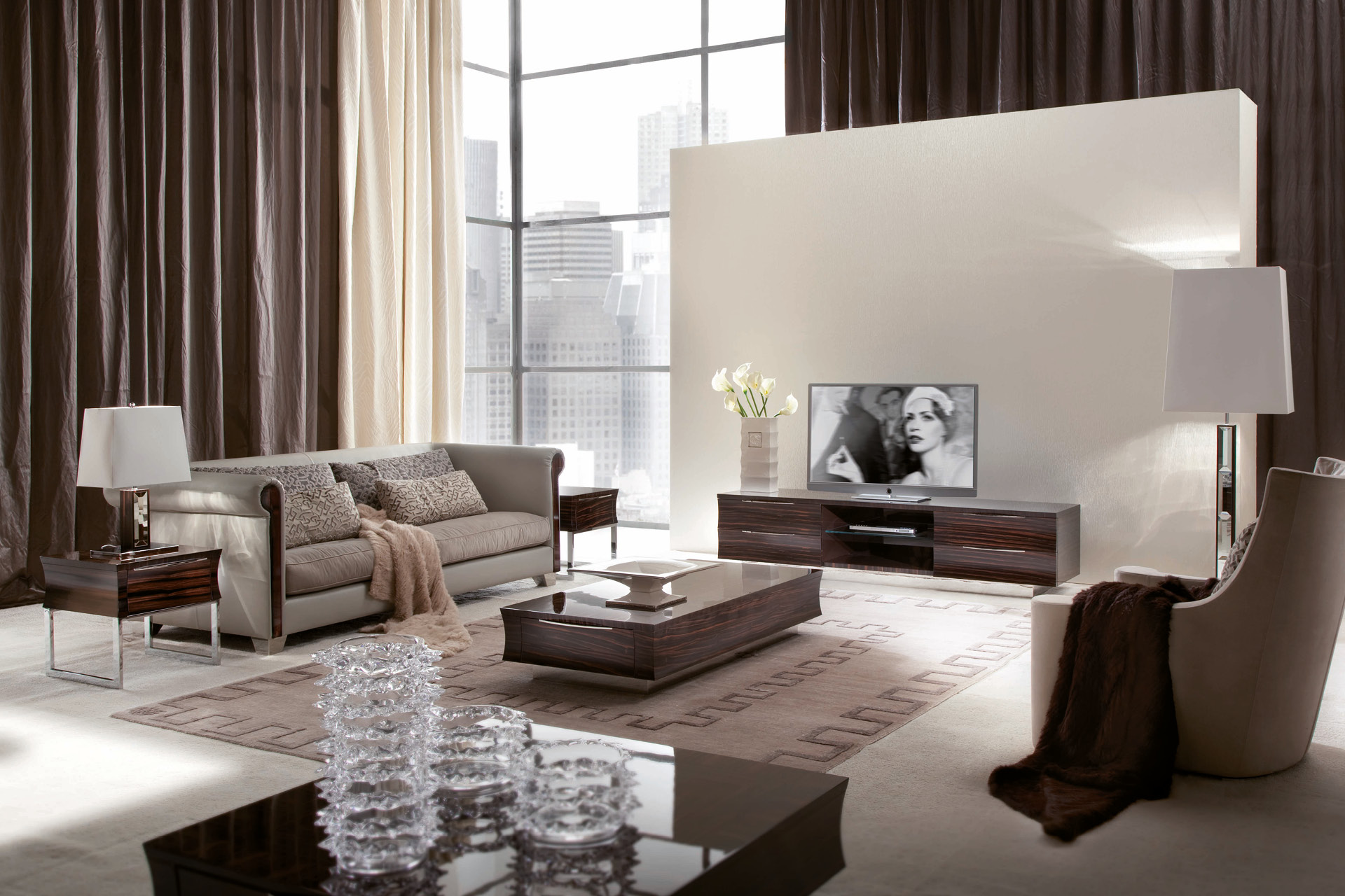 Base for plasma T.V. unit ebony veneer in satin finish. 4 full extension drawers with bottom in velvet fabric and 1 center opened space w/glass shelf with led light. inlay's top in ebony veneer. Chrome stainless steel base and handles.