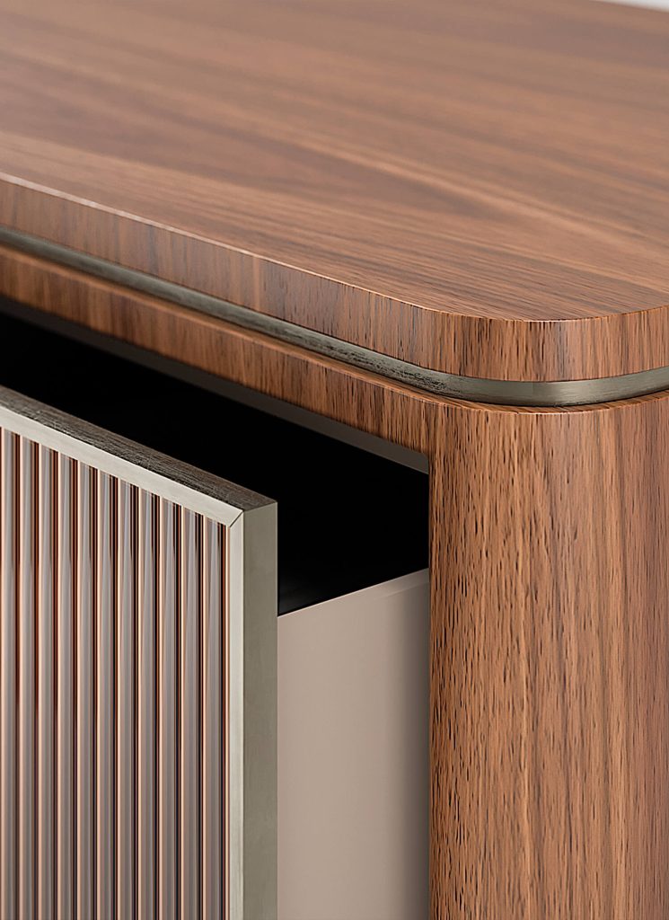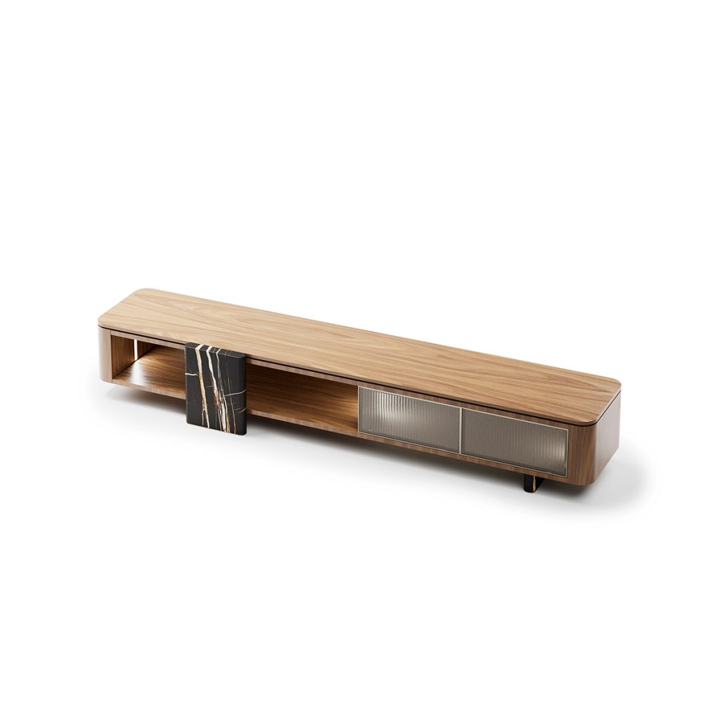 Structure in essence or lacquered. Vertical element and base in marble. 2 drawers with bronzed glass front. Details in metallic finish