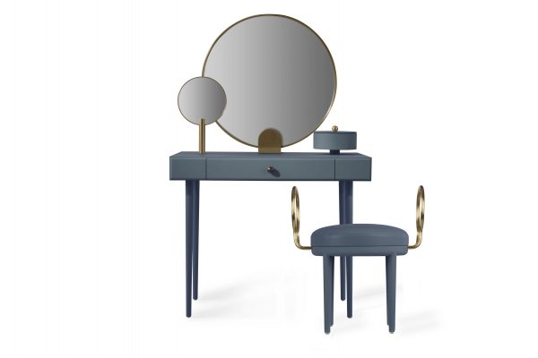 Rose Sélavy得名自法國(guó)藝術(shù)家、達(dá)達(dá)主義核心成員馬塞爾?杜尚筆下的一個(gè)虛構(gòu)角色。Rose Sélavy線條清秀,水彩色和玫瑰金配件構(gòu)成了優(yōu)雅的配色,無(wú)處不在歌頌女性之美。梳妝臺(tái)臺(tái)面上有一個(gè)精巧的盒子供擺放珠寶首飾。梳妝臺(tái)有一面中央圓鏡,另配有一面小圓鏡置于一邊,可以隨時(shí)取下作為手持鏡使用。