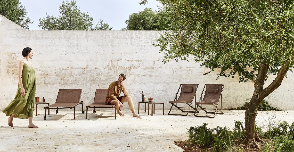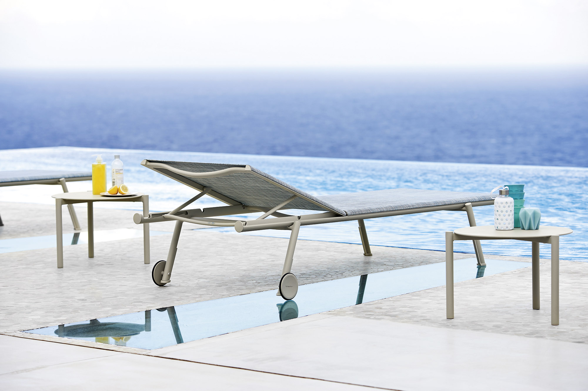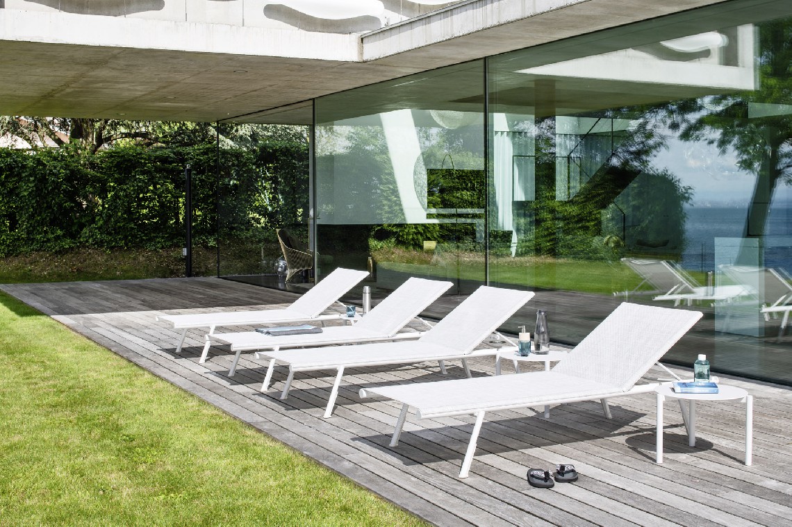 Bahia is a light and handy sunbed, perfect for the beach or swimming pool. Its essential design is embellished with small details that soften the rigorous lines of the structure, such as the circular section of the legs which is revealed on the side of the seat. The version with wheels and cushion allows greater ease of movement for these sunbeds which, when not in use, can be stacked in groups of ten and stored.