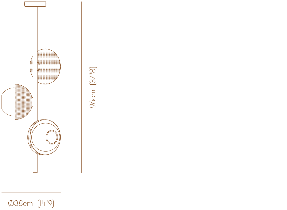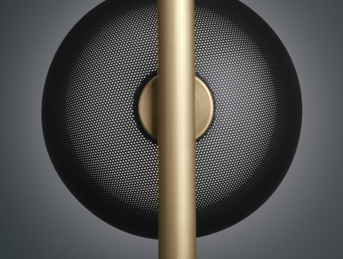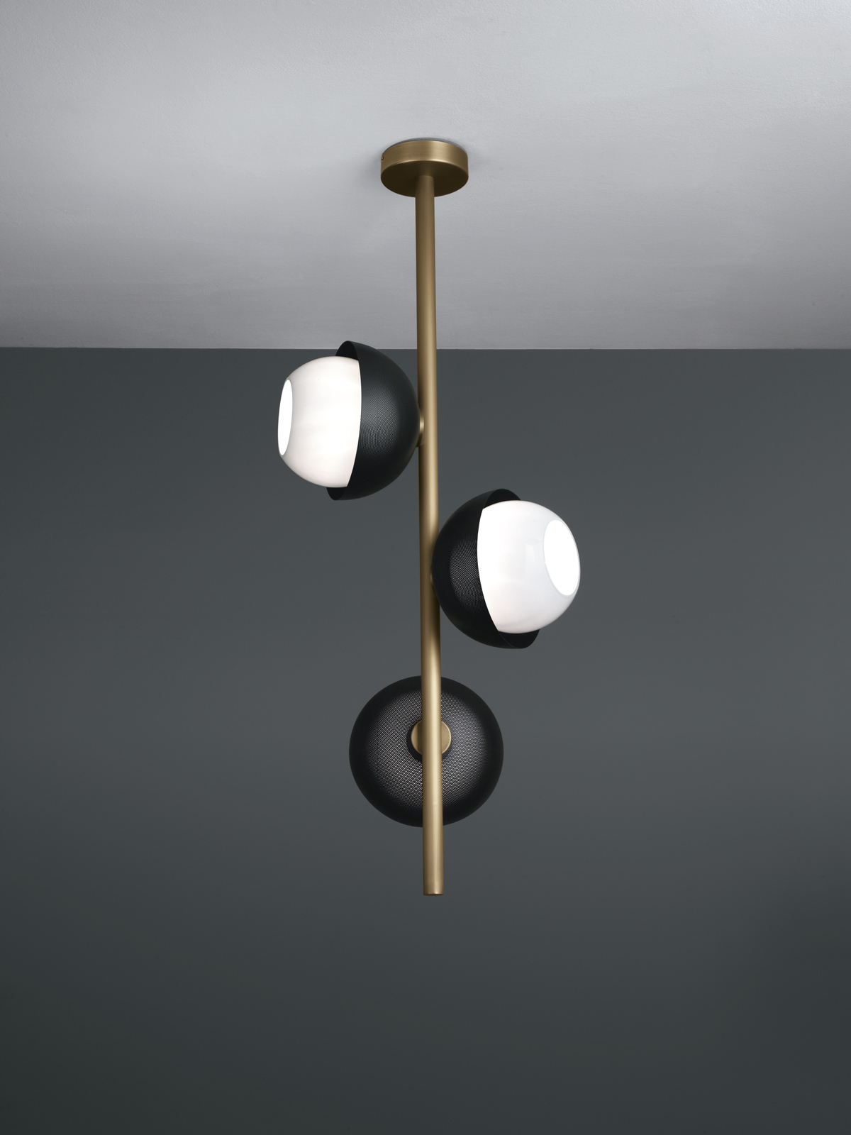 Suspended lamp with diffused light. Light or dark burnished brass structure with matte gold or matte black perforated metal lampshades. White Murano blown glass diffusers.