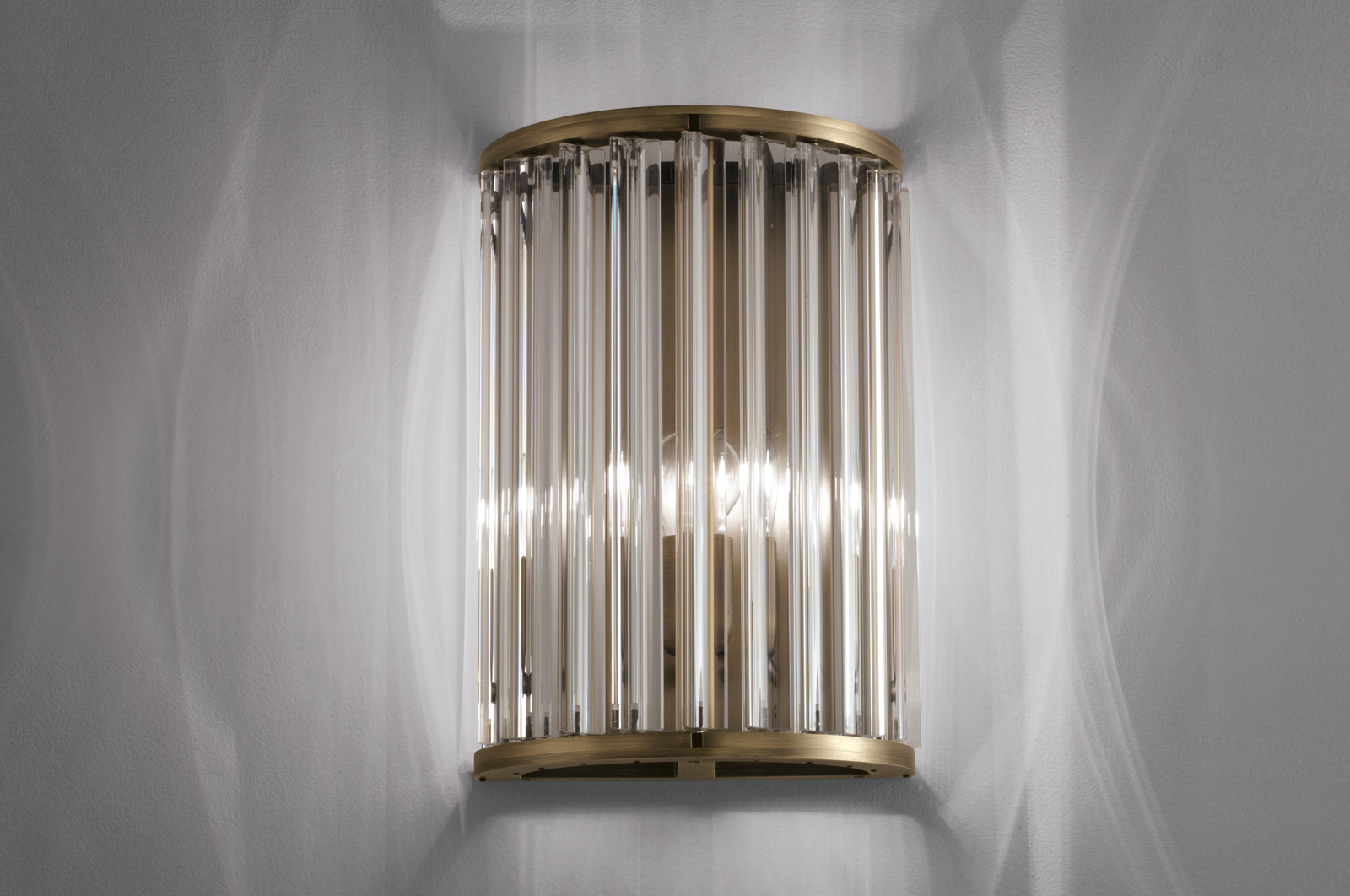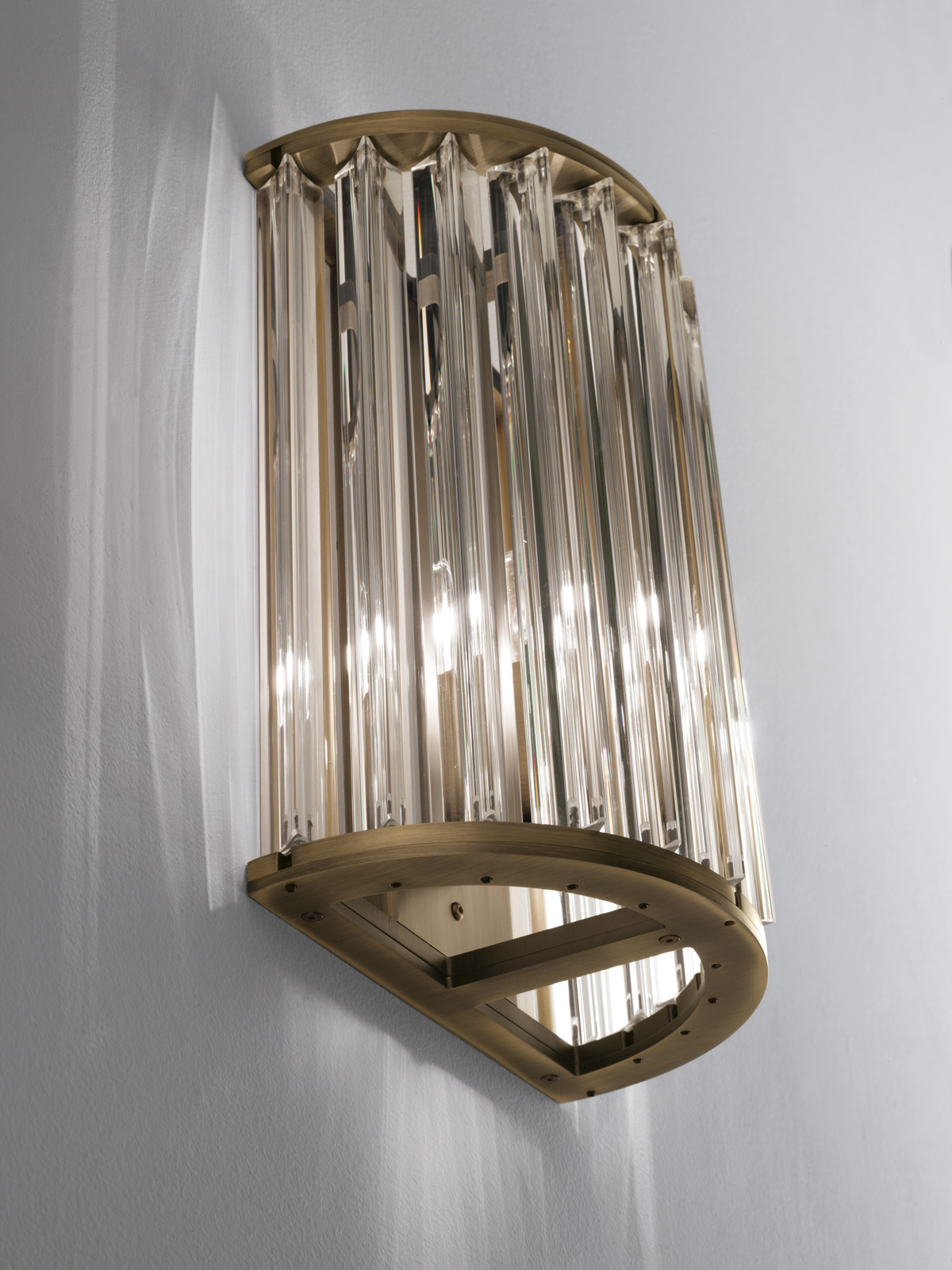 Wall lamp with diffused light. Matte black nickel or light burnished brass structure and crystal, amber or smoke grey Murano blown glass trihedrons.