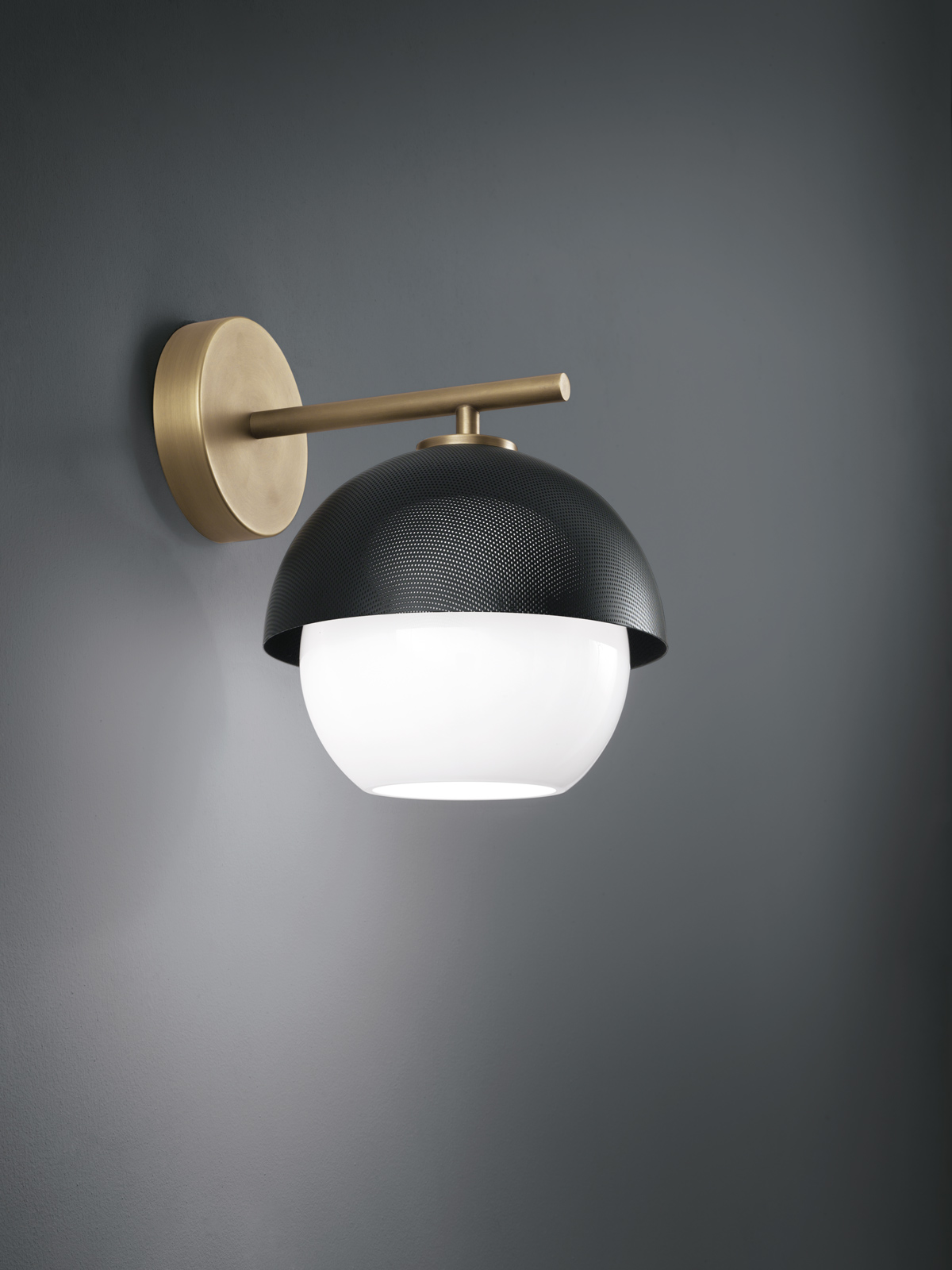 Wall lamp with diffused light. Light or dark burnished brass structure with matte gold or matte black perforated metal lampshade. White Murano blown glass diffuser.