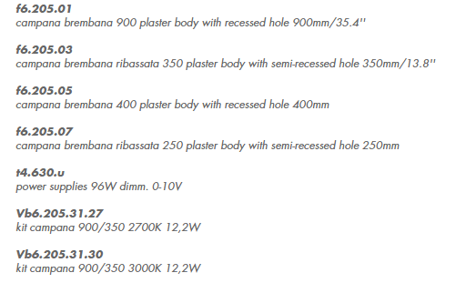 damp location rated recessed ceiling light fitting for indoor use. made of painted plaster to totally integrate within the architecture. several lighting kits available to be installed in the light fitting to create different scenographies. versions: campana brembana 900 fully concealed sizes 1200x1200x900mm/47.2x47.2x35.4’’ with diameter ?800mm/31.5’’ hole, campana brembana ribassata 350 sizes 1200x1200x350mm/47.2x47.2x13.7’’ with diameter ?750mm/29.5’’ hole protruding by 142mm/5.5’’ from the ceiling, campana brembana 400 sizes 595x595x400mm/23.4x23.4x15.7’’ with diameter ?405mm/15.9’’ hole, campana brembana ribassata 250 sizes 595x595x250mm/23.4x23.4x9.8’’ with diameter ?365mm/14.3’’ hole protruding by 37mm/1.4’’ from the ceiling. 2700K 3000K and 4000K Ra95 6W and 12.2W led kit. 120-277V power supply not included, to be installed remotely. possible 1-10V dimming. finishes: white painted plaster.
