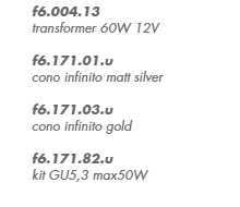 fully concealed dry location rated light fitting for indoor use. made of oxidised aluminium. the fully recessed fitting leaves only a diameter ?84mm/3.1’’ hole visible in the suspended ceiling. versions: cono infinito diameter ?210mm/8.3’’ h.297mm/11.7’’. suitable for halogen or led bulb, MR16 12V up to 50W, not included. 120V 60Hz transformer excluded, to be installed remotely; finishes: matt silver or gold oxidised recessed fitting.