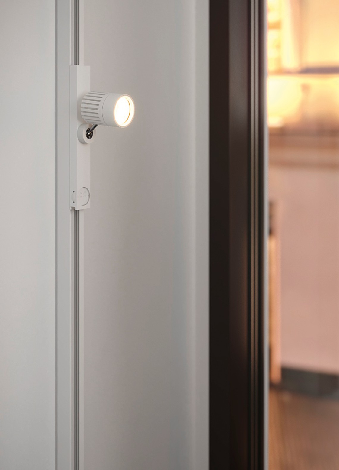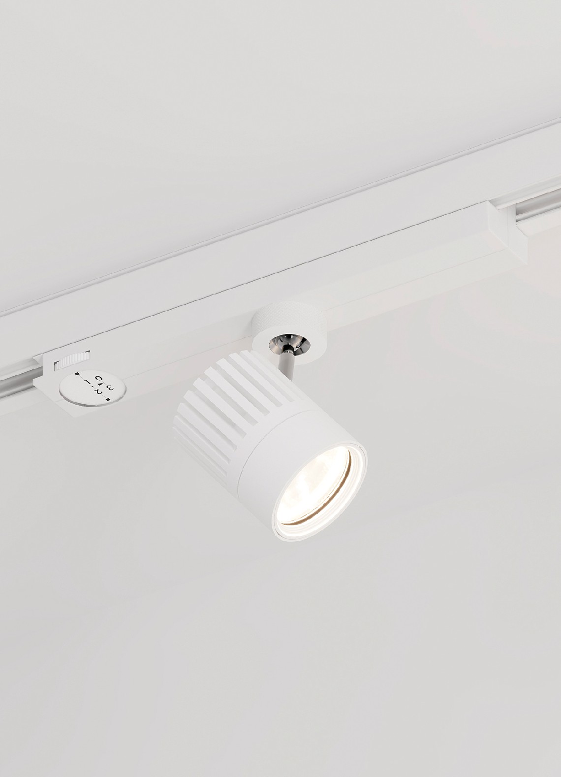 dry location rated track-mounted light fitting for indoor use. made of powder coated oxidized aluminium, consisting of diameter ?55mm/2.2’’ h.69mm/2.7’’ spotlight fixed to an adapter through a turning joint, adjustable by 360° on the vertical axis and by 90° on the horizontal axis. wired with les6 11,6W or les14 16.8W 2700K or 3000K up to 1791lm led source. optics: 13° 19° 35° 36° 120V 50-60Hz power supply included, also available in dimmable version with potentiometer. finishes: my bianco, nero55.
