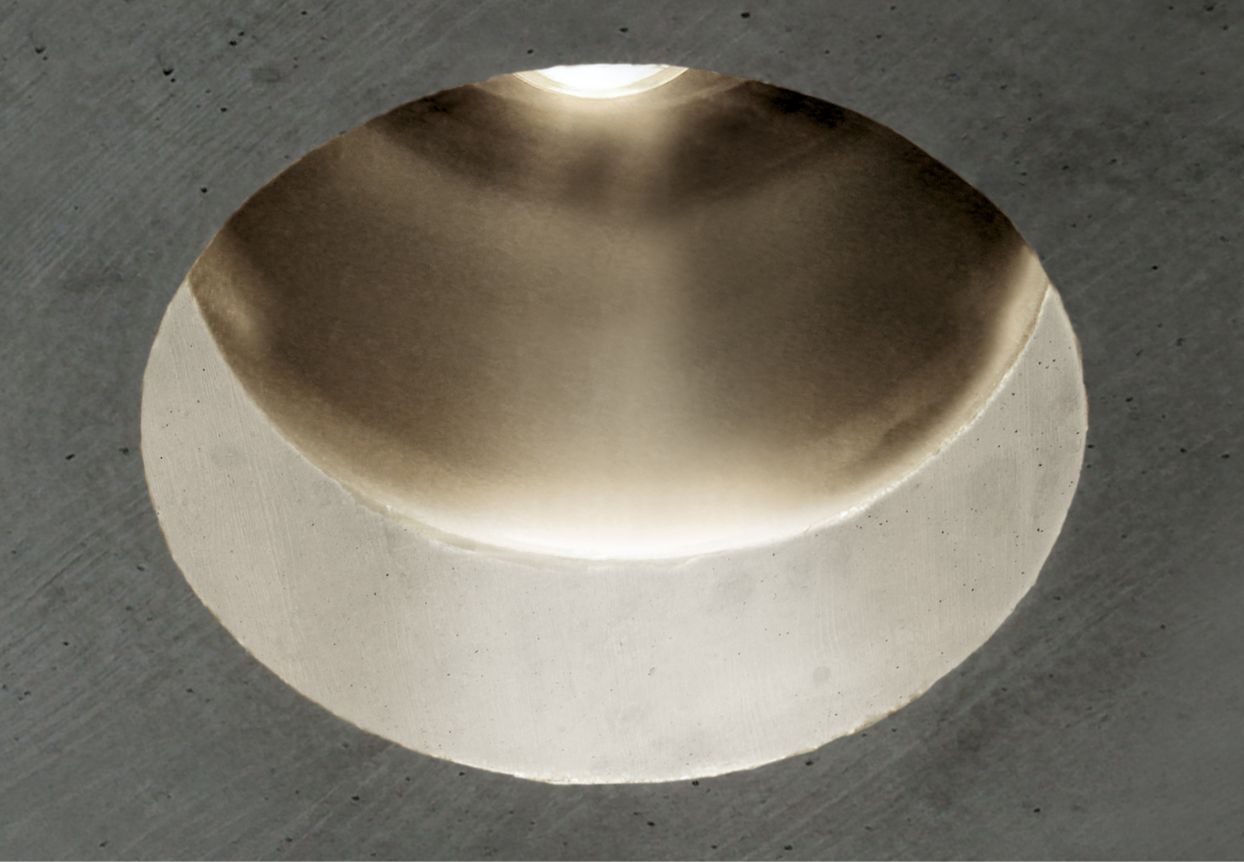 damp location rated recessed light fitting for indoor use. made of oxidized aluminium, with a diameter ?170mm/6.7’’ h.150mm/6’’ or h.200mm/7.9’’ cylindrical housing, concrete recessed throught 30mm/1.2’’, 60mm/2.4’’ o 90mm/3.5’’ thick caps. wired with 2700K or 3000K Ra98 led source up to 34W 3000lm, available with medium or wide beam. light beams may vary depending of the chosen components. constant current power supply not included, to be installed remotely. finishes: nero55.