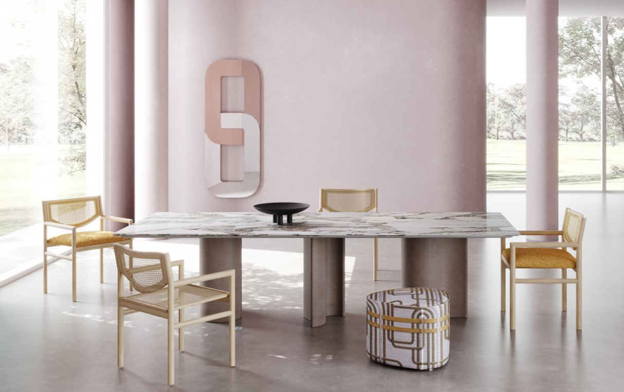 An original design characterized by the contrast of the two-tone silver and pink mirror.