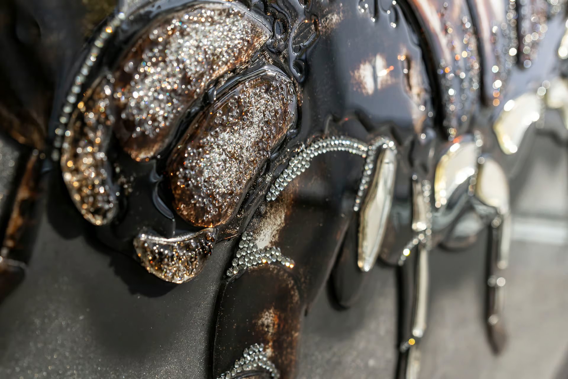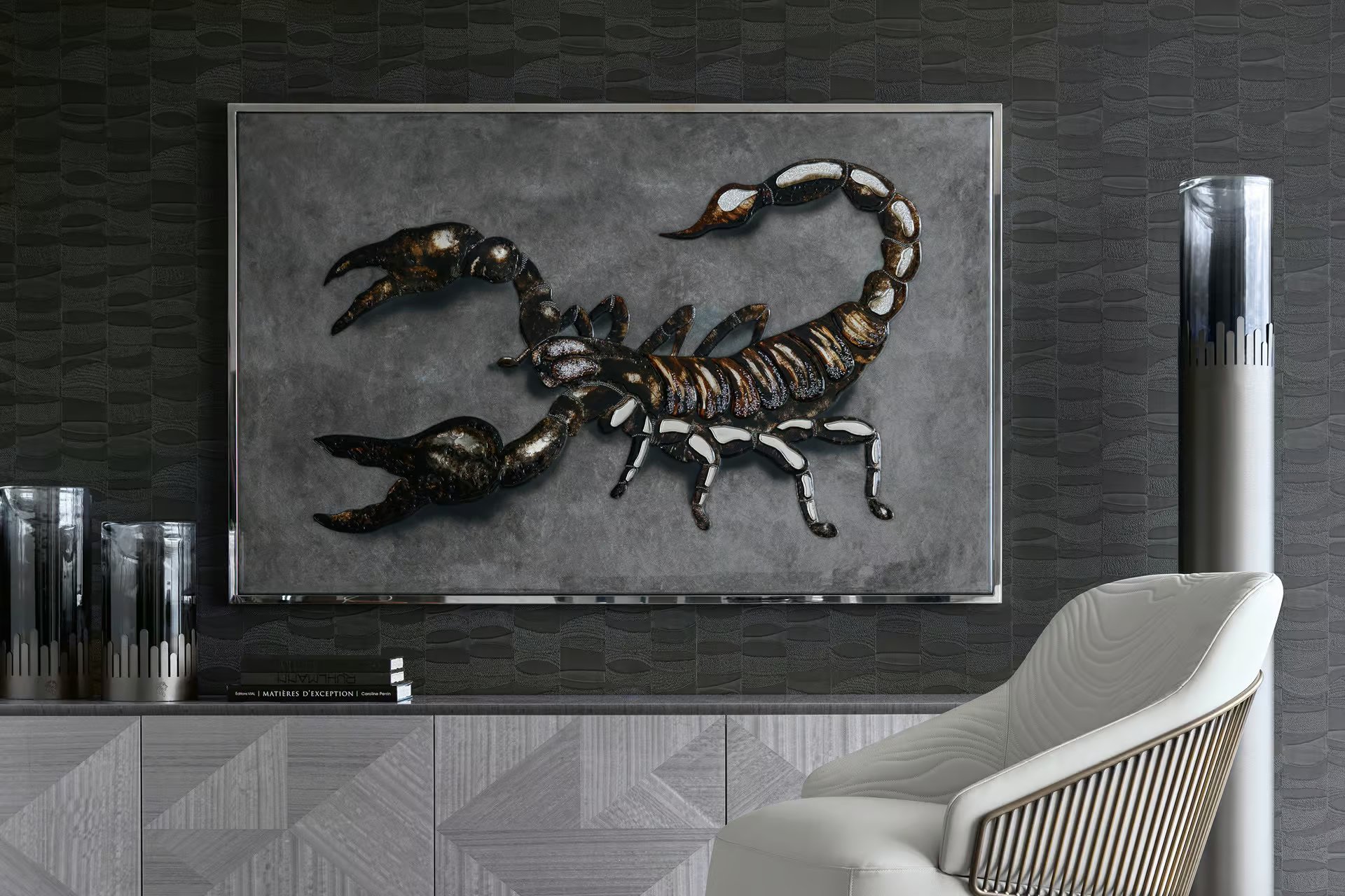 Rectangular painting in wooden structure with stainless steel frame. Epoxy resin with UV protection base in combination of "Swarovski” crystals and hand-cut clear mirror glass.
