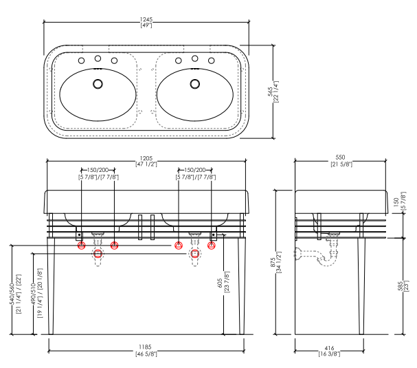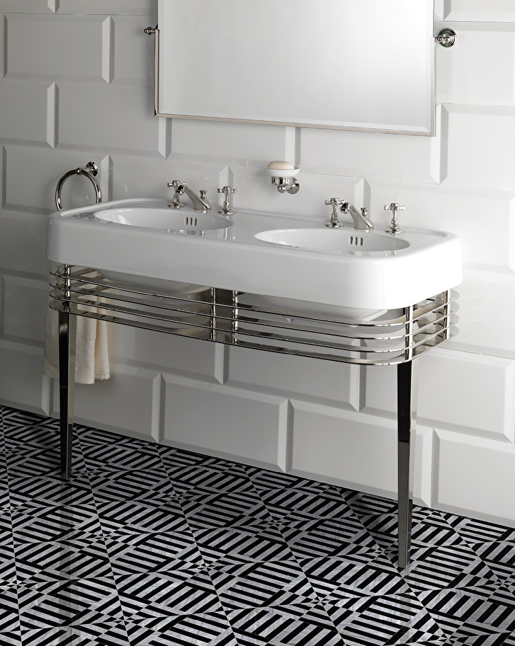It is a large console characterized by the solid geometical design of the ceramic single-block top with two large oval basins. Its pyramid-shaped legs support the aluminium structure of horizontal metal strips inspired by the original design of the most luxurious vintage cars. It is available in chrome, light gold and polished nickel.