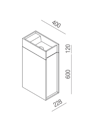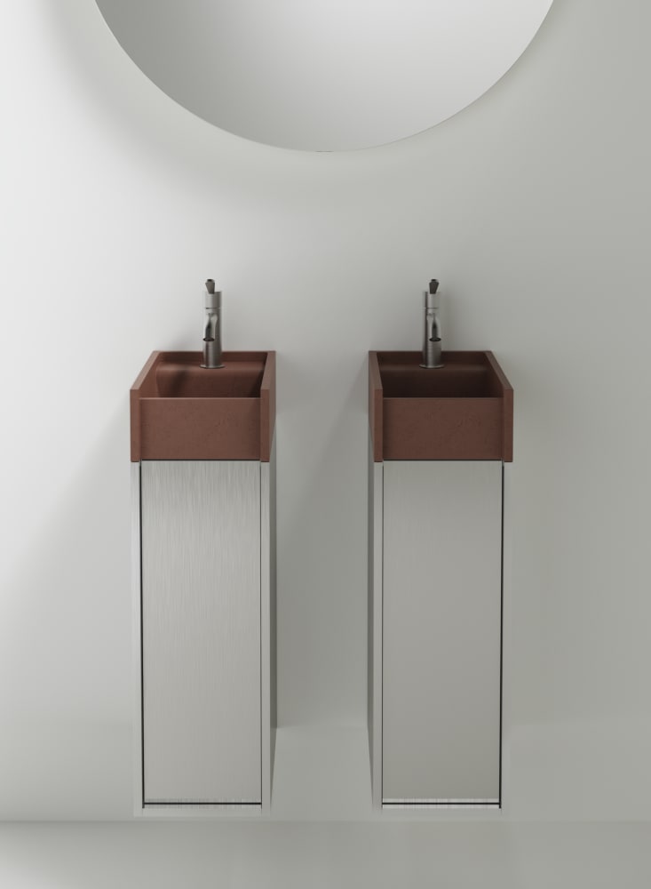 Minimal dimensions and extreme flexibility for a modular object in two variants, both playing on the same sizes: 20 x 40 cm. In the perpendicular version, fixed to the wall along the shorter side, the washbasin is complemented by a container with a drawer with two shelves. The version parallel to the wall, fixed on the longer side, is integrated with a container with hinged door and two shelves or a flap door towel basket. The washbasin is made of concrete in various finishes while the container is available in two different materials: wood in multilaminar veneer in oak or teak finishes or brushed stainless steel, also suitable for outdoor use. The series also includes a version with a garden hose holder inside the container.