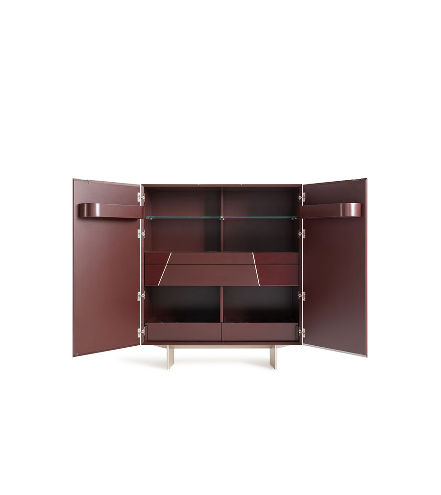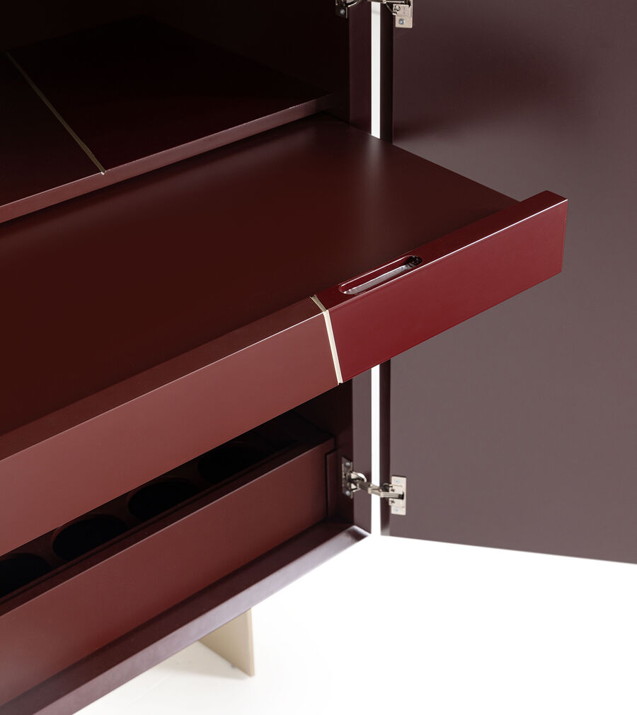 The visual expression of a refined style, the Selbit mobile bar, designed by Toan Nguyen, has a wooden structure with steel feet and leather handles with the FF logo. The facade, available in a choice of inlaid or lacquered finish, features a out-out motif inspired by Karl Lagerfeld’s Astuccio design. The cupboards and drawers together create the optical allusion of a single piece in this sideboard that effortlessly interprets the demands of contemporary living.