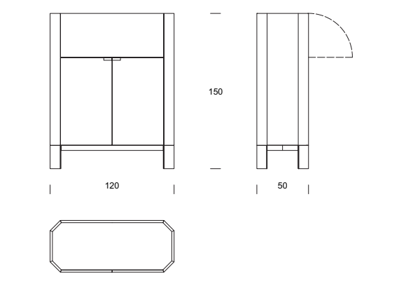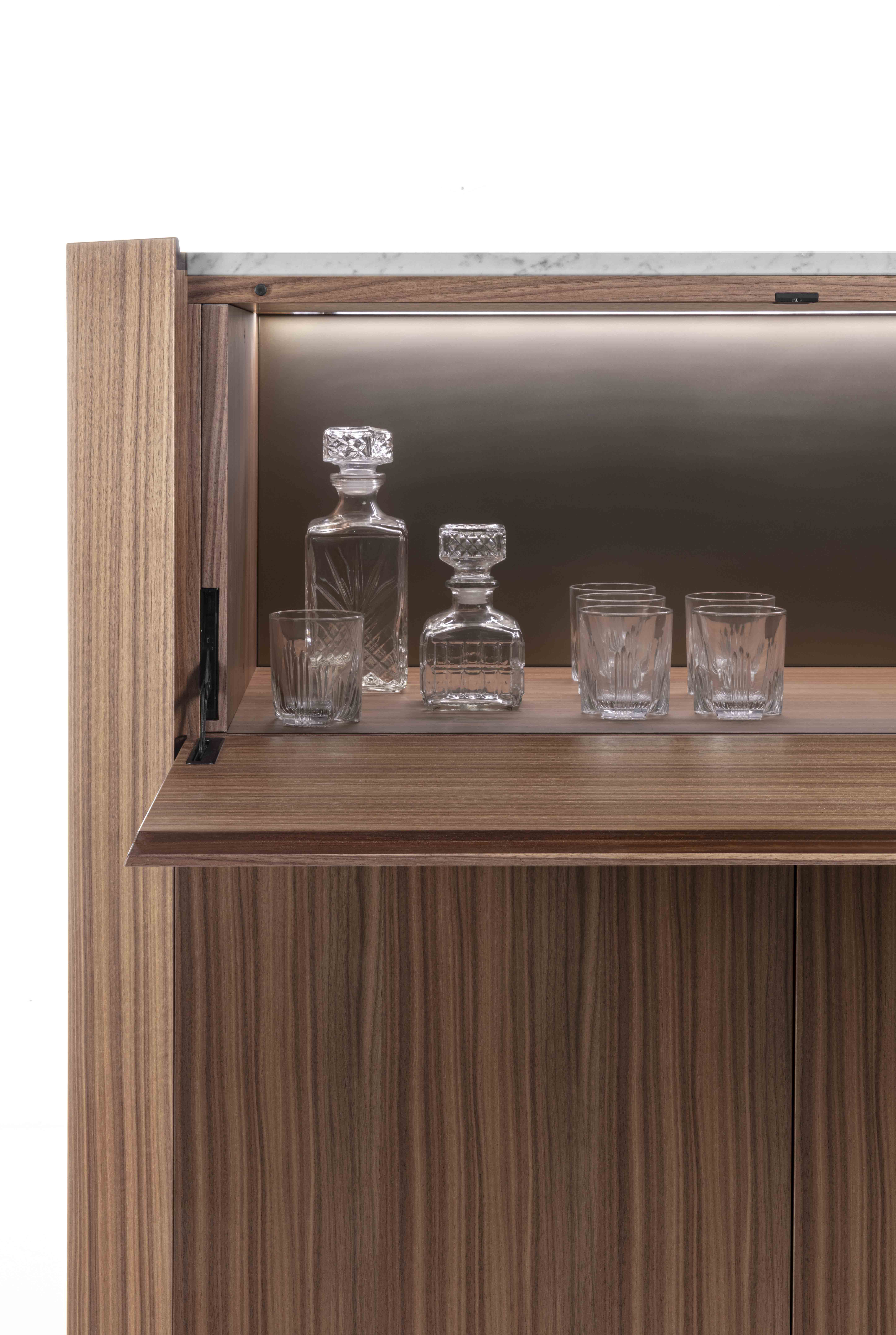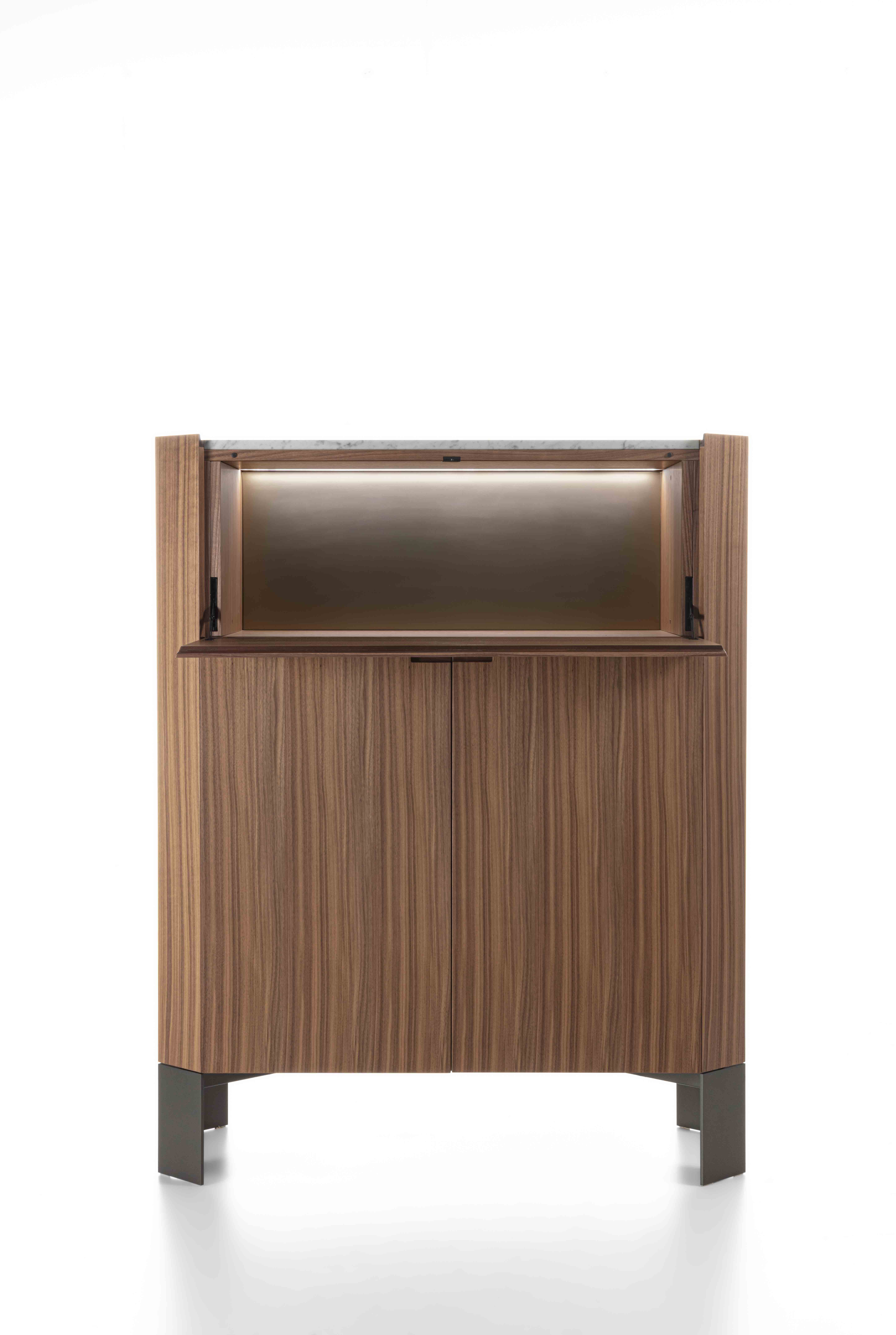 Storage unit with wooden doors and/or flap and marble or wooden top. The base is in metal and the internal division is characterized by wooden shelves.