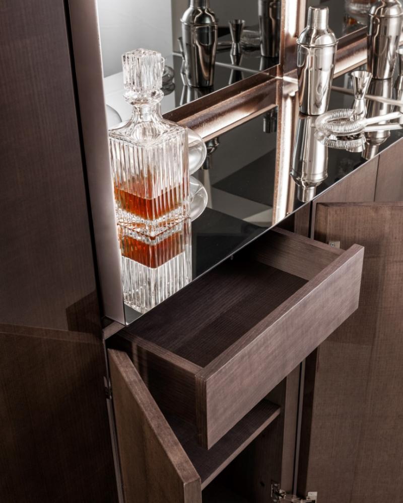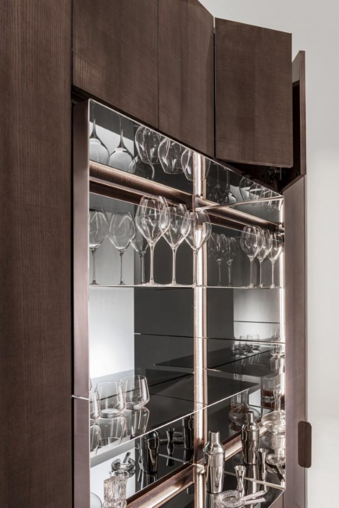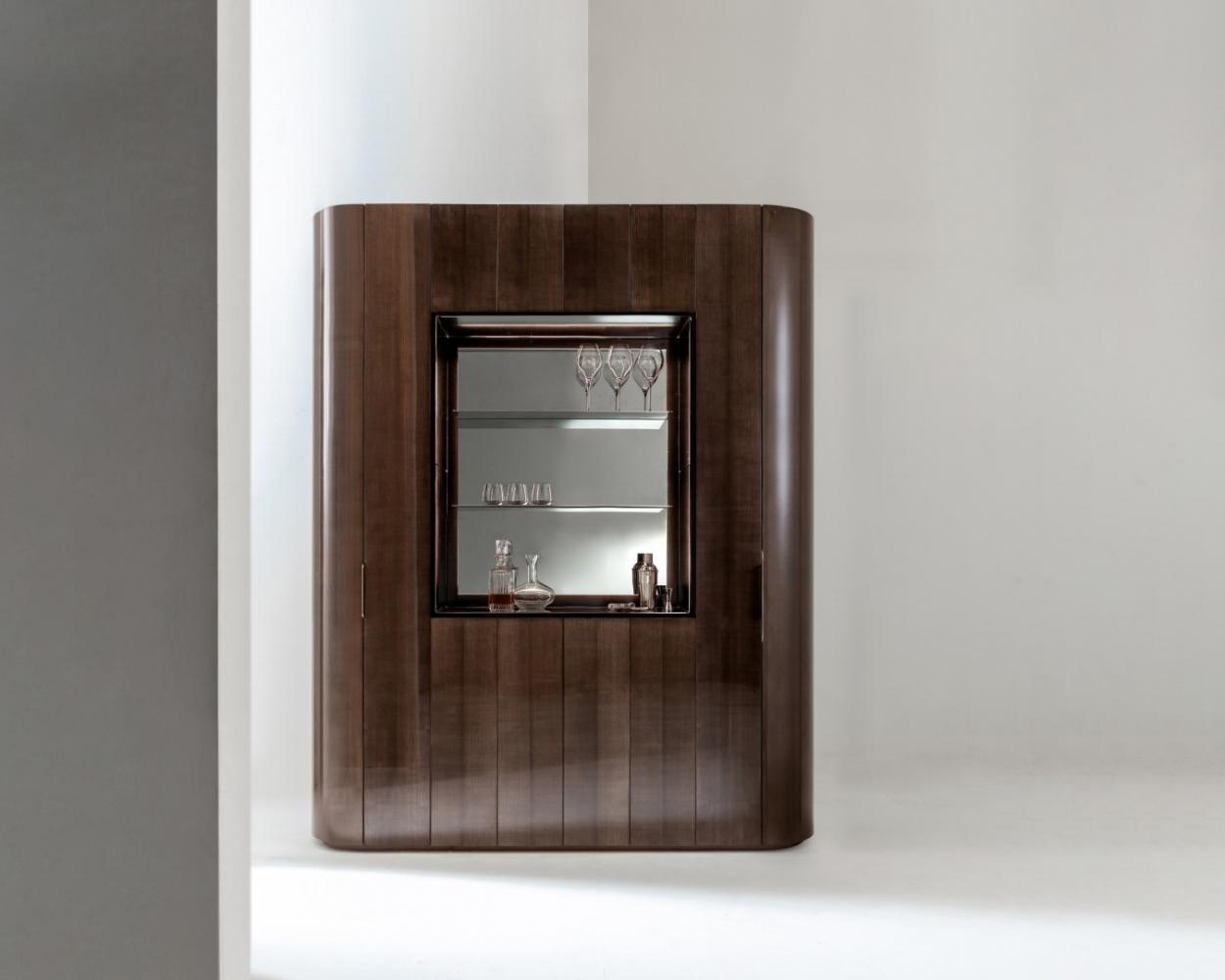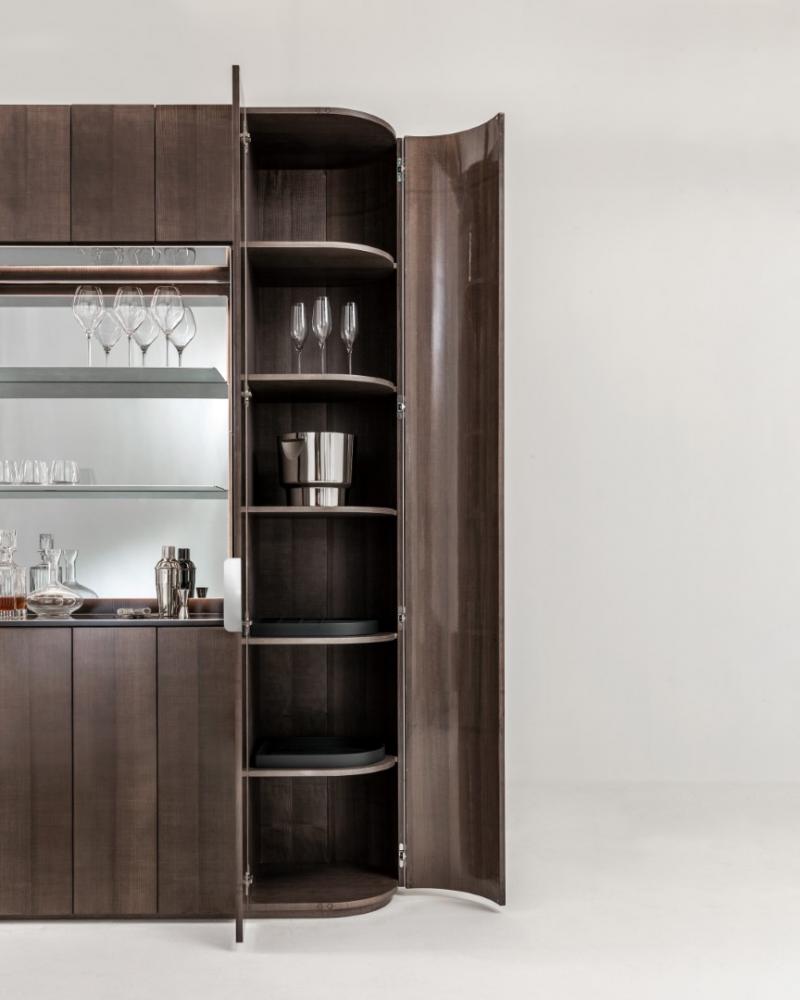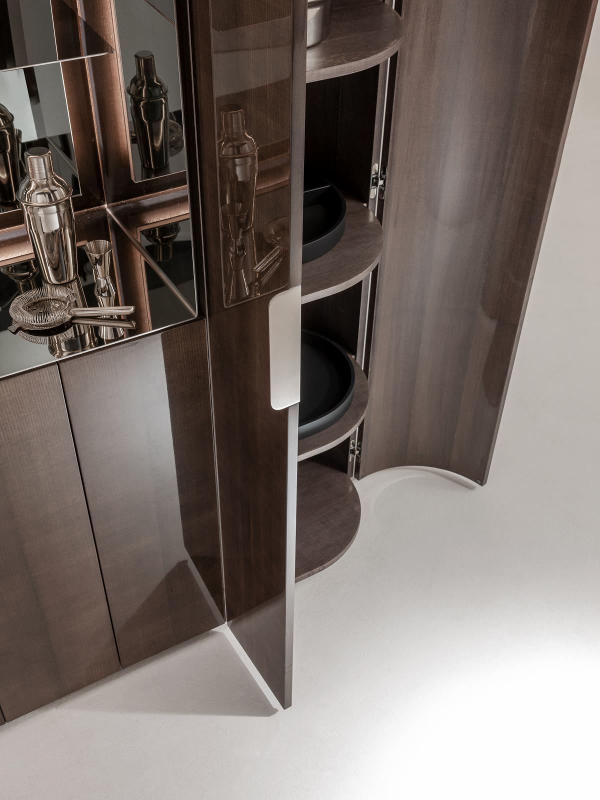 Tall storage unit with 12 hinged doors and curved sides. Wooden structure finished on all sides. Equipped with internal shelves and drawers. Open compartment lined with polished steel, featuring a mirrored back panel and glass shelves.