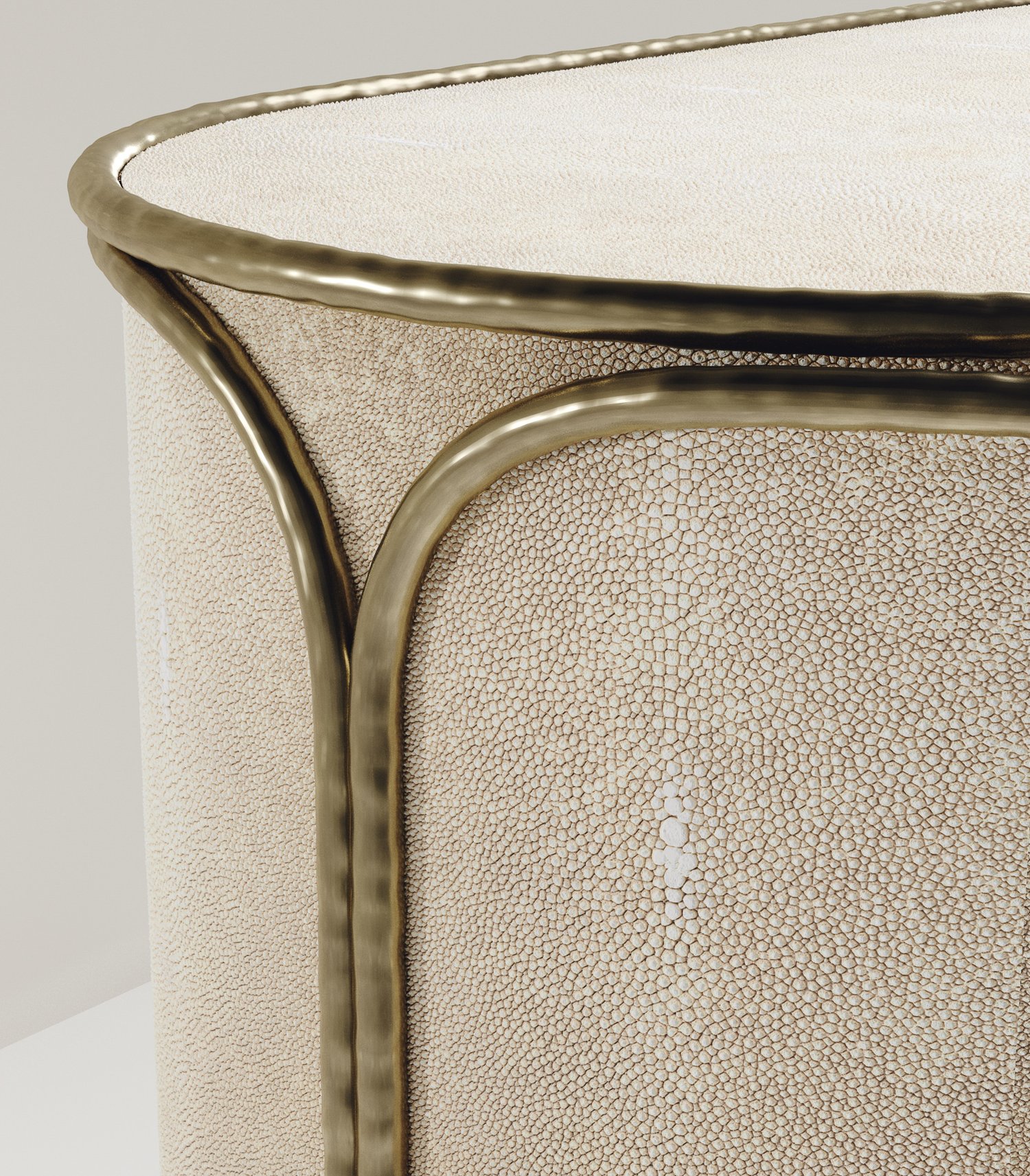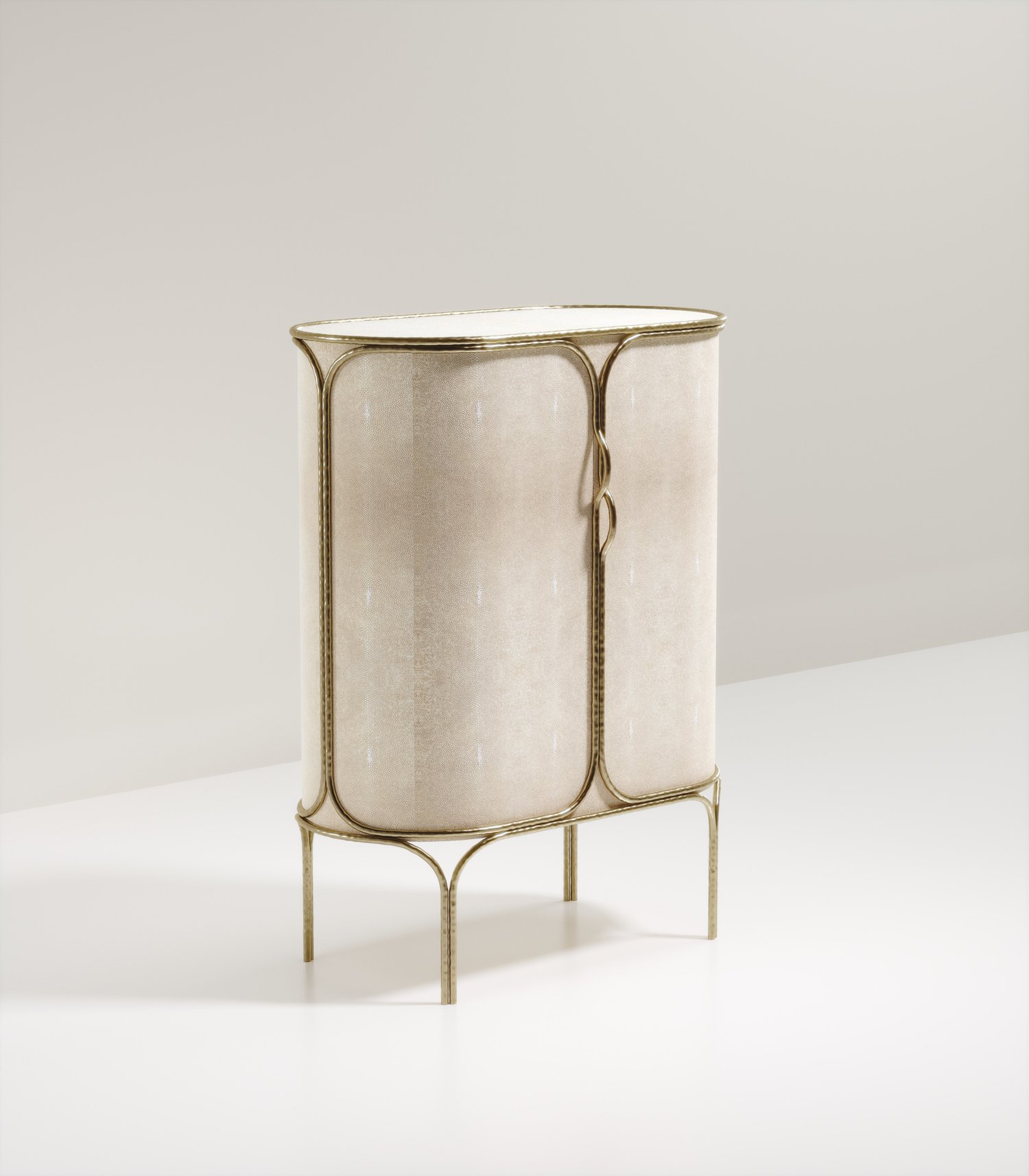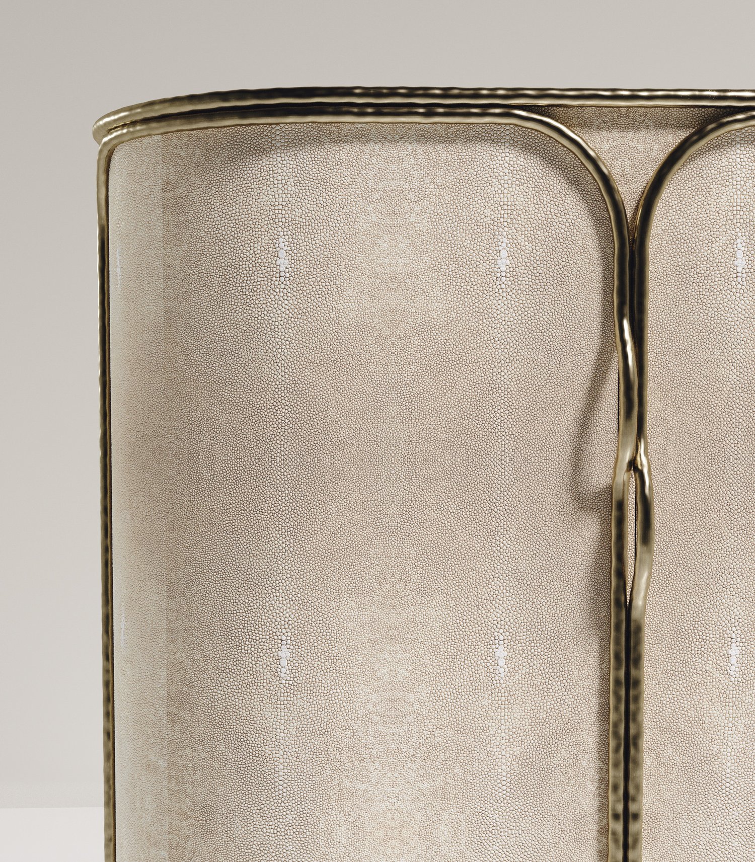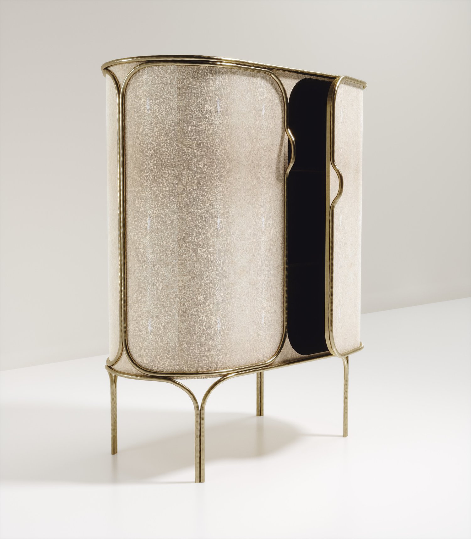 The Arianne bar cabinet by R&Y Augousti is one of a kind statement piece. The overall piece is inlaid in cream shagreen accentuated with intricate bronze-patina brass details that have the signature Augousti "melting" effect. The interior of the piece is in wood veneer and opens to 3 shelves. This piece is part of the Arianne Capsule.
