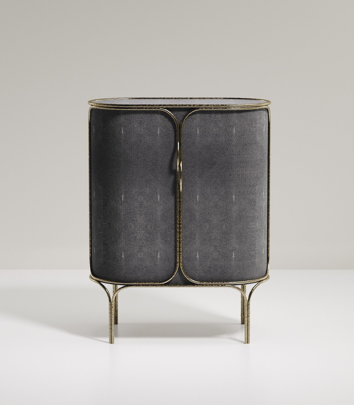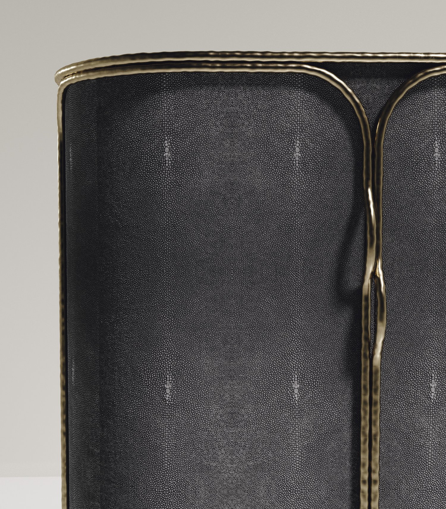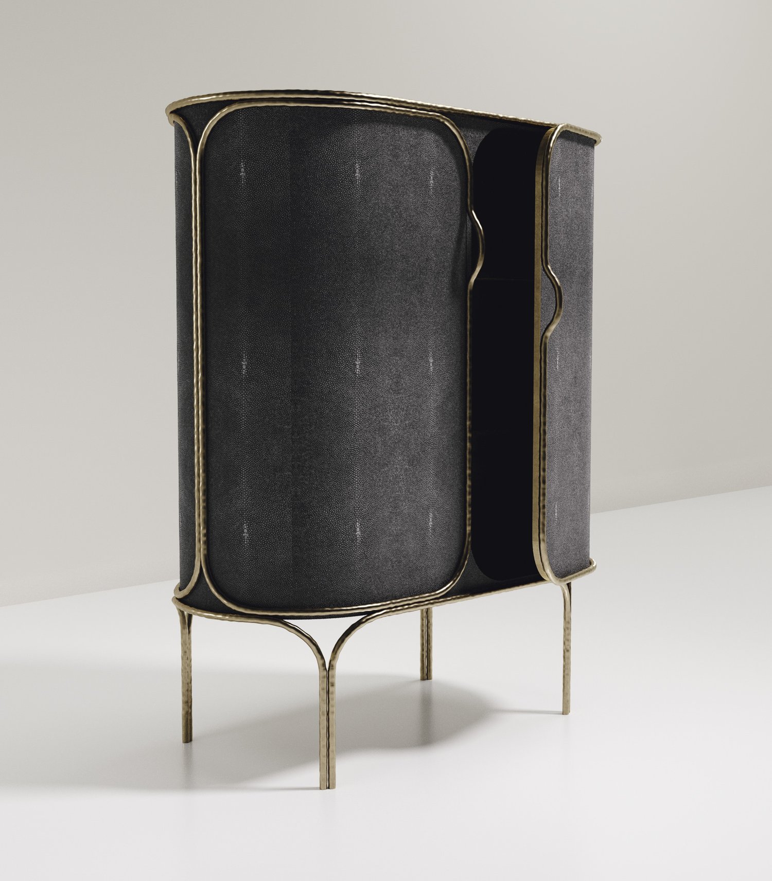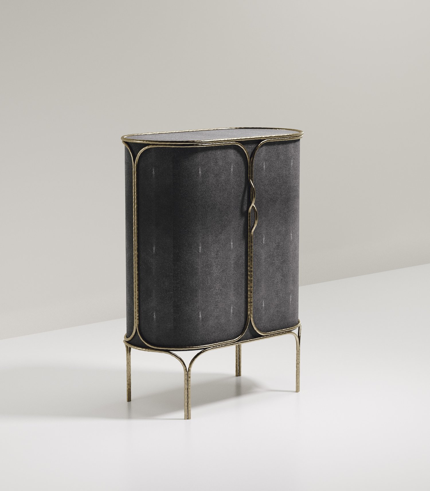 The Arianne bar cabinet by R&Y Augousti is one of a kind statement piece. The overall piece is inlaid in cream shagreen accentuated with intricate bronze-patina brass details that have the signature Augousti "melting" effect. The interior of the piece is in wood veneer and opens to 3 shelves. This piece is part of the Arianne Capsule.