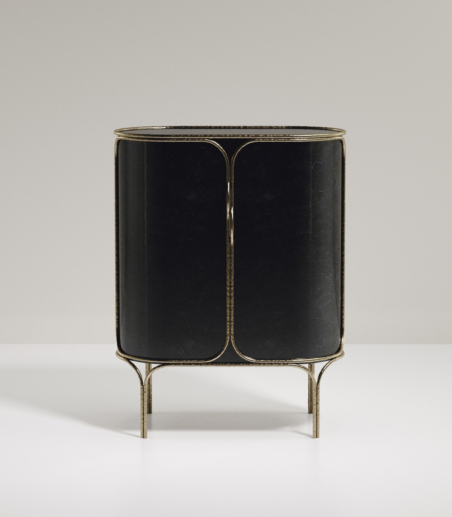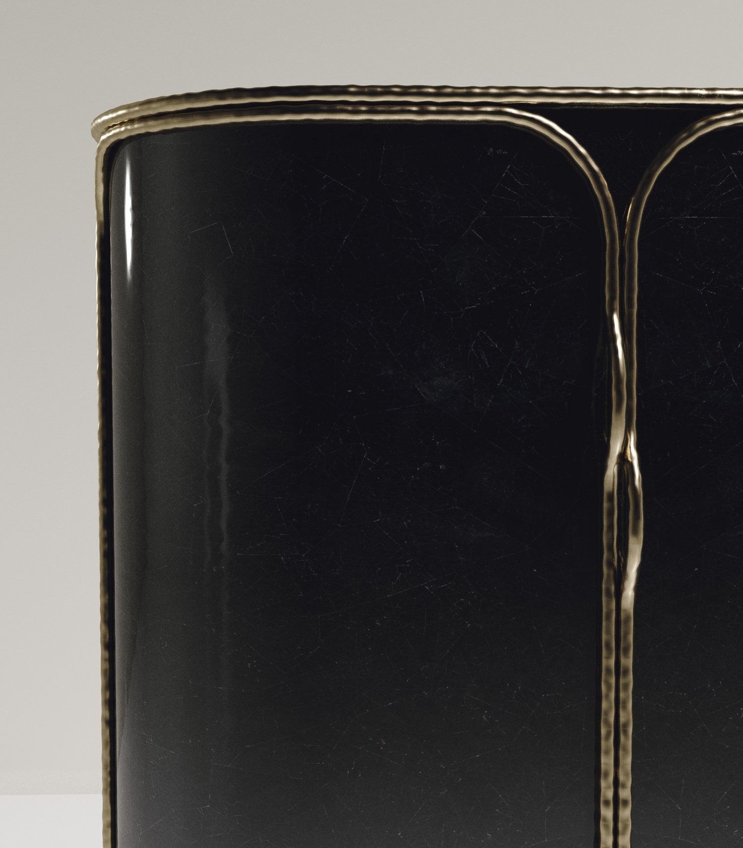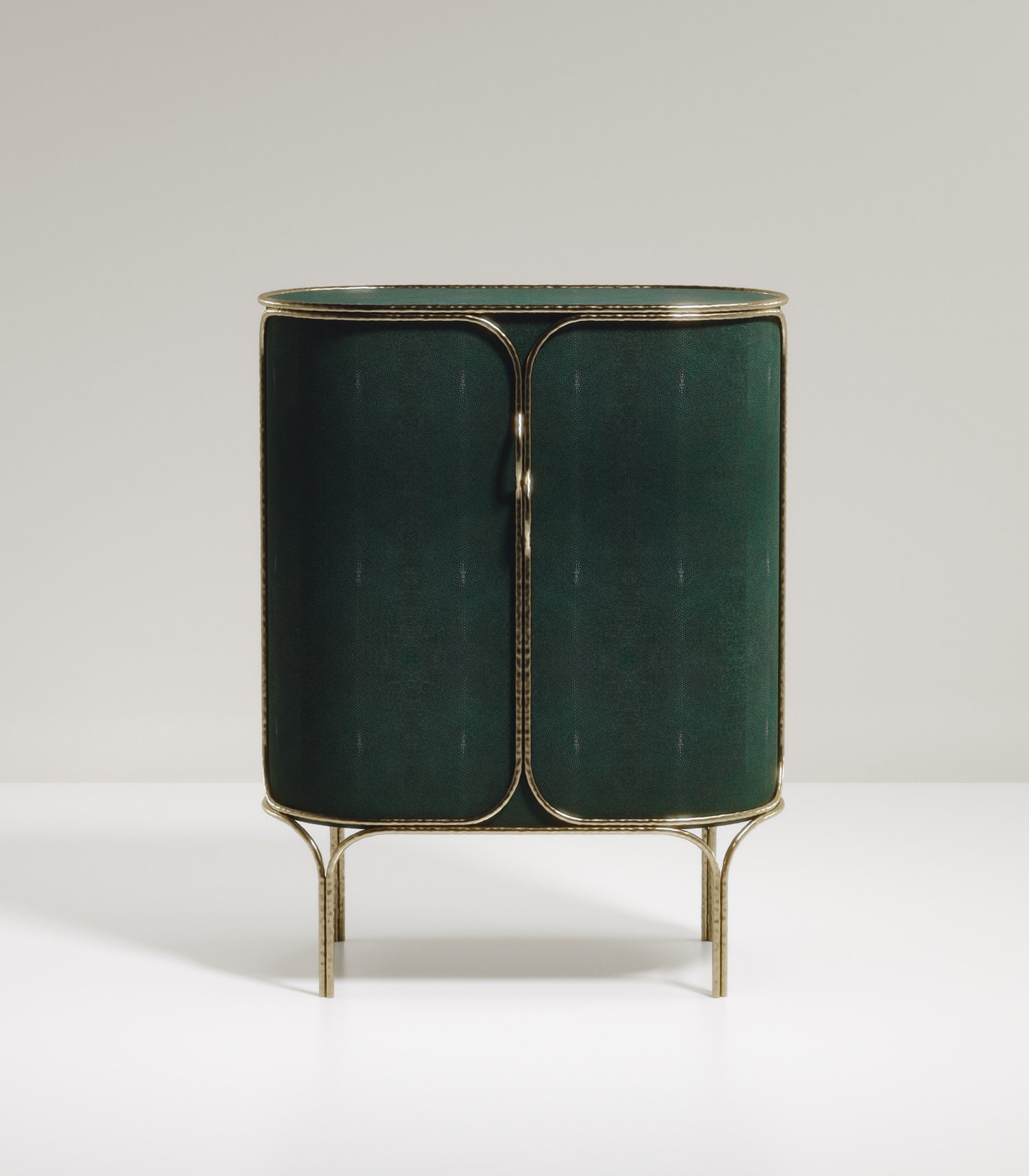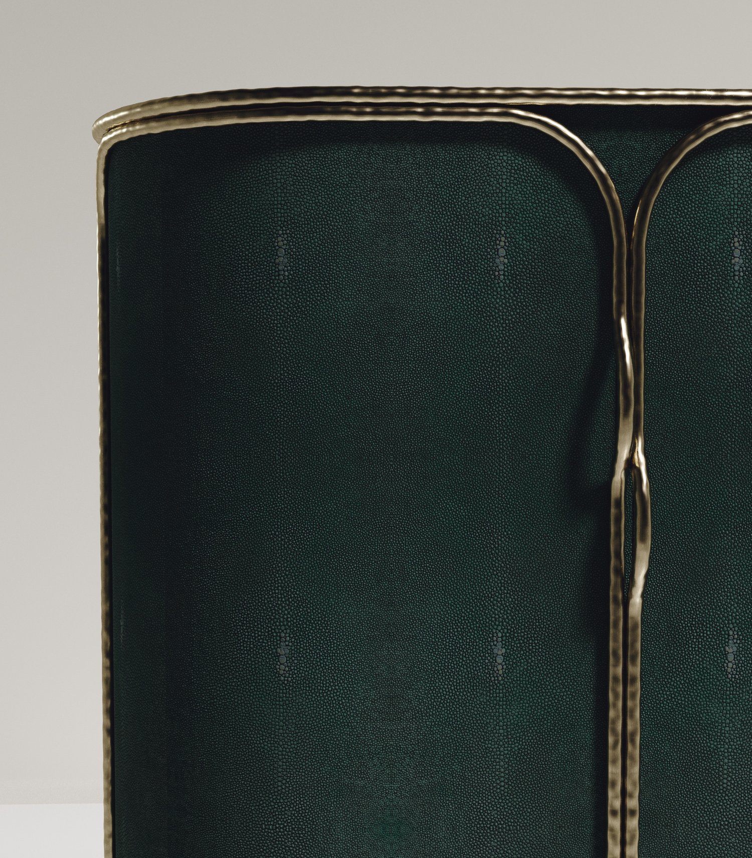 The Arianne bar cabinet by R&Y Augousti is one of a kind statement piece. The overall piece is inlaid in cream shagreen accentuated with intricate bronze-patina brass details that have the signature Augousti "melting" effect. The interior of the piece is in wood veneer and opens to 3 shelves. This piece is part of the Arianne Capsule.