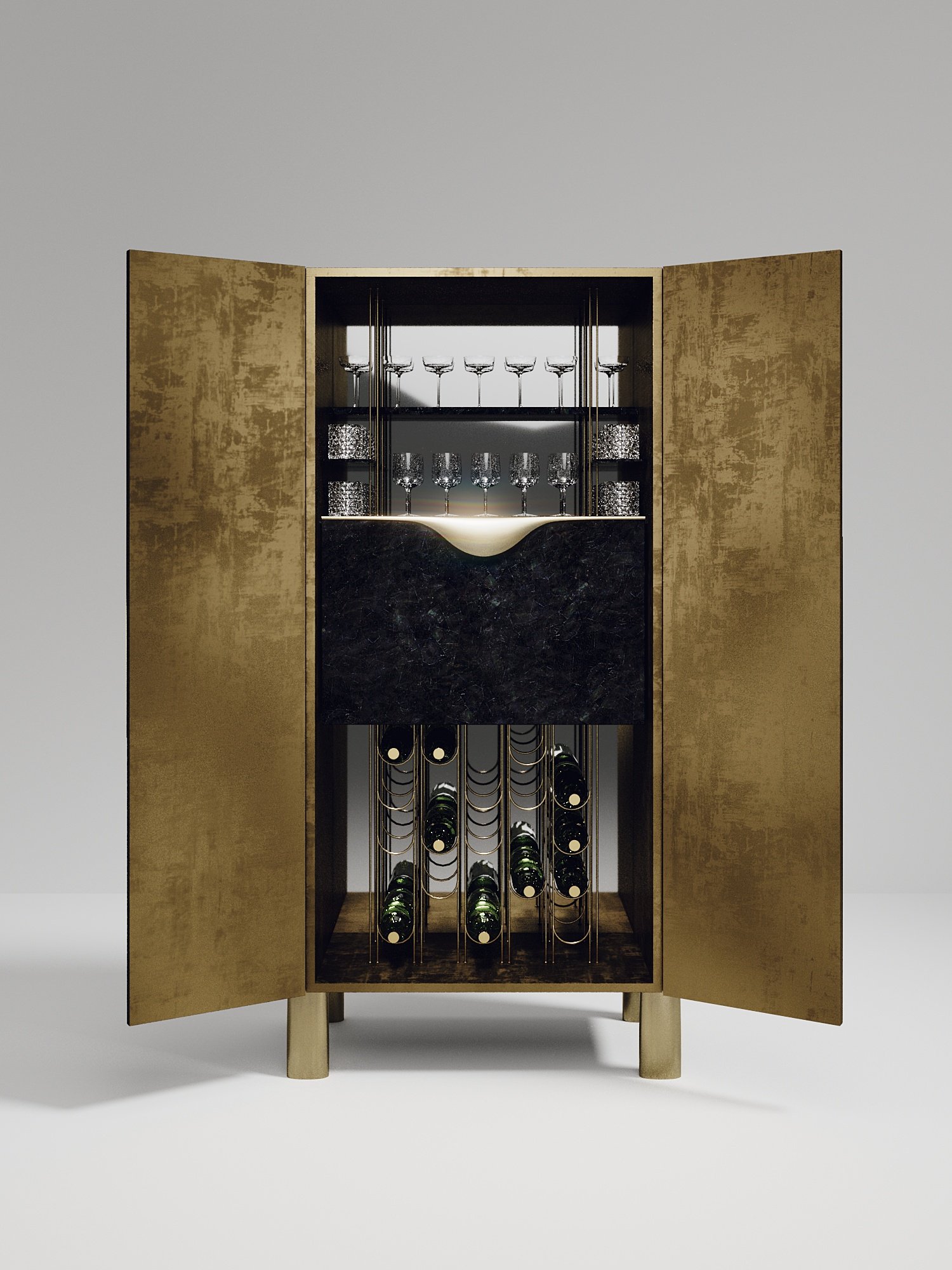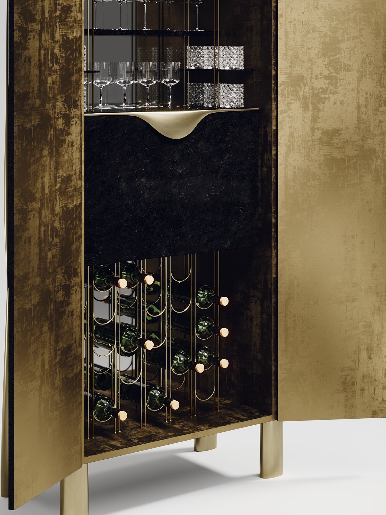 The Wave Bar Cabinet by R&Y Augousti is one of a kind statement piece. The overall piece is inlaid in coal black shagreen, with the exterior hand-carved in an updated version of the signature Augousti "rhomboid" pattern. The door handles and legs are in a bronze-patina brass. The interior of the piece opens up to an ultra luxe bar. The interior includes a back wall lined in a mirror, a flap top compartment in shell, bronze-patina brass shelving and shagreen drawers. The walls are in gilded-gold. Available in other finishes and as a vanity cabinet
