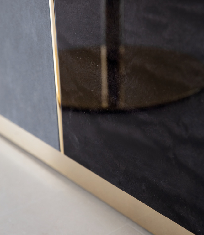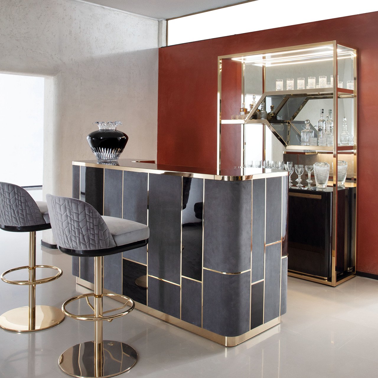 Bar with fronts in combination of Black Bubinga burl veneer with high gloss polyester finish and grey nubuk color nr 6. Details and base in light gold chrome stainless steel. Tops in smoked tempered glass.