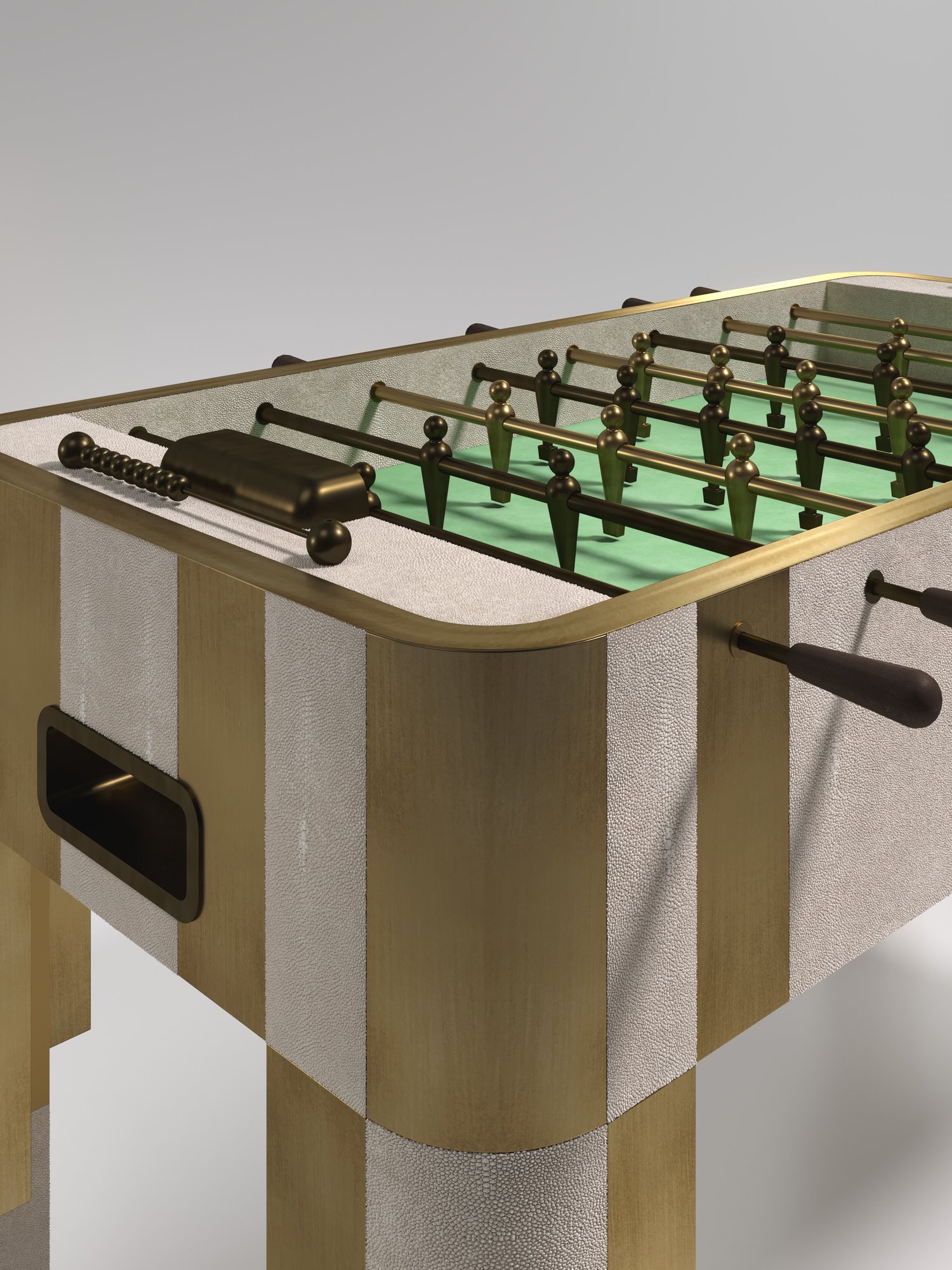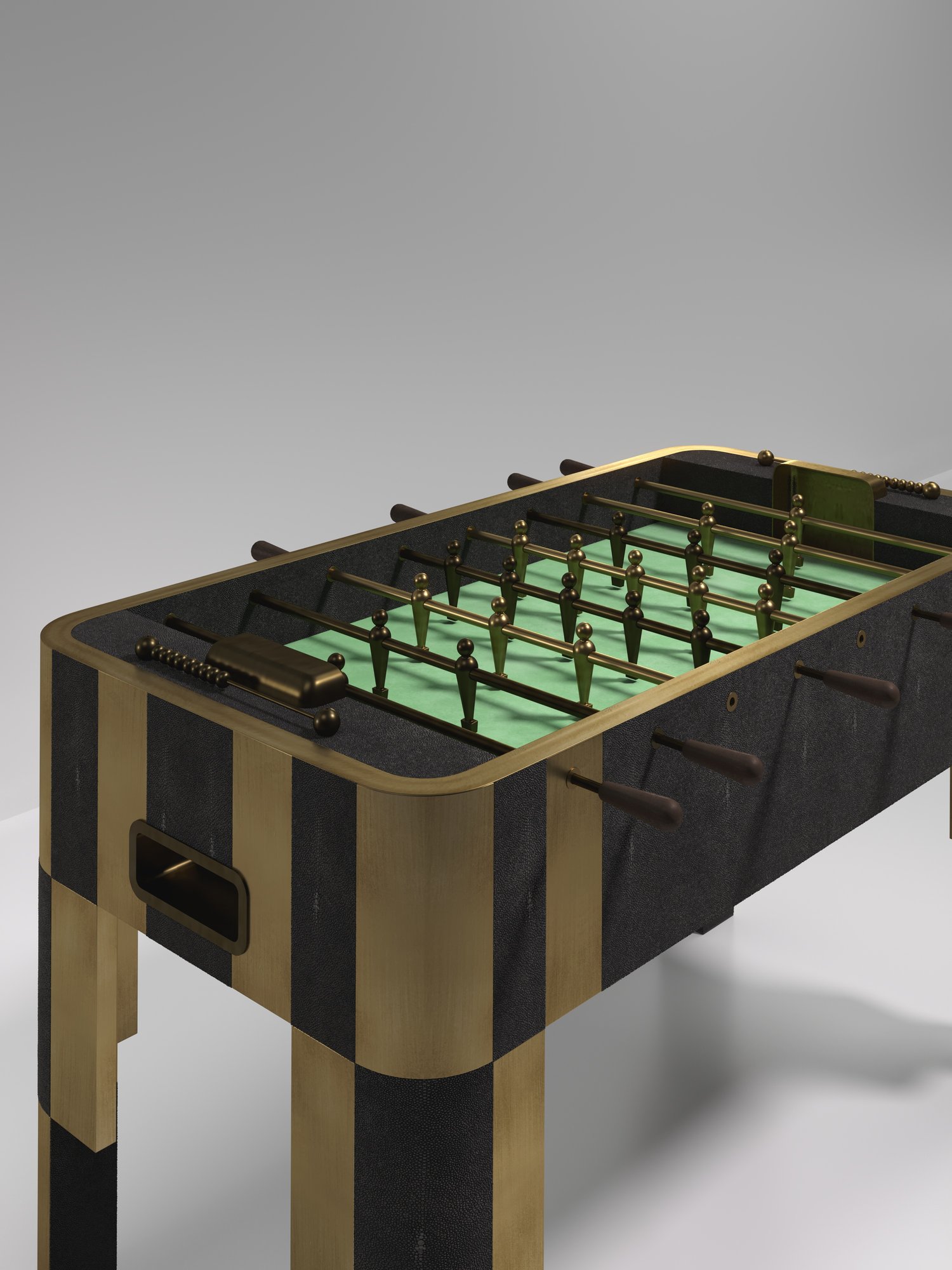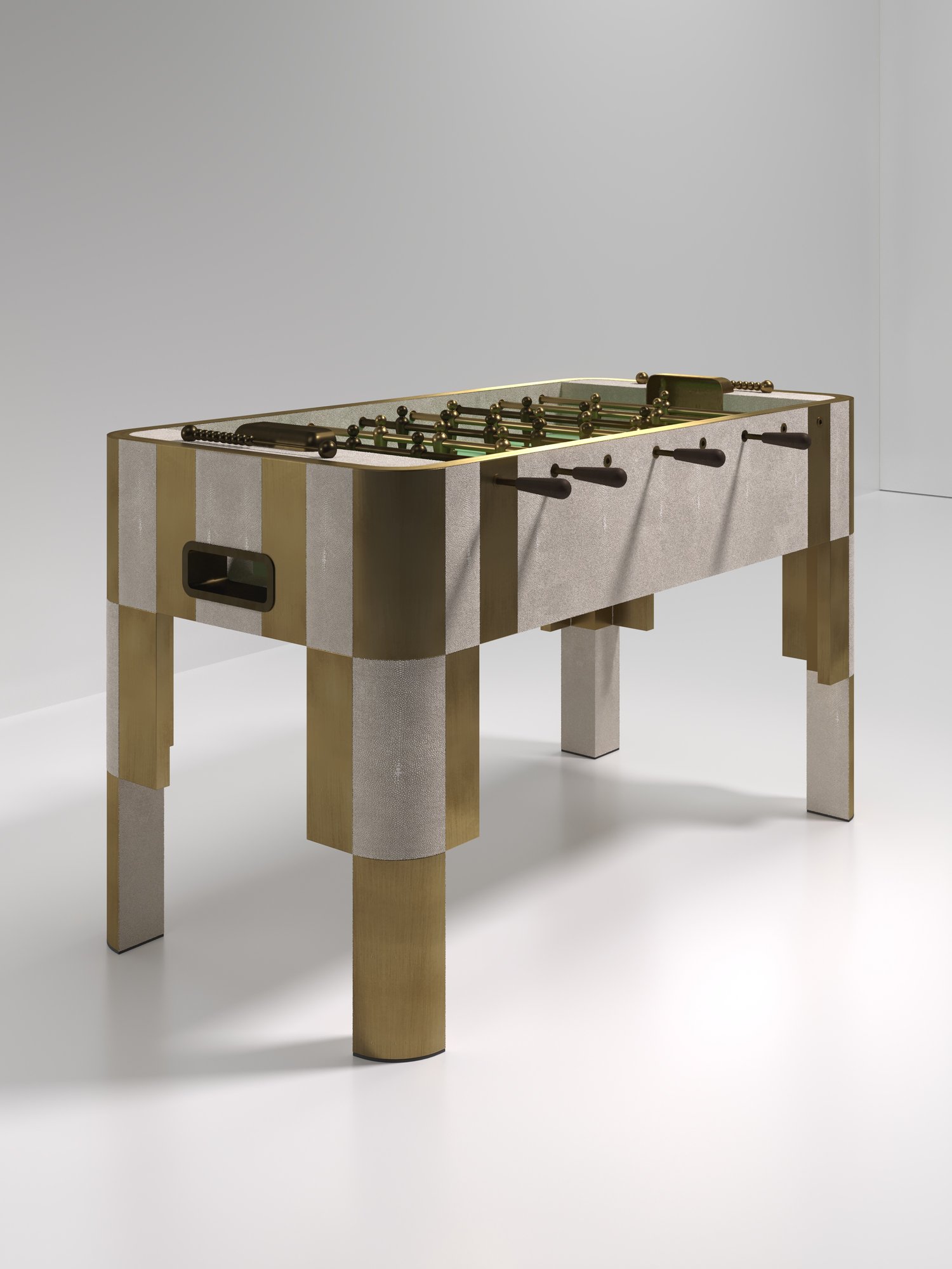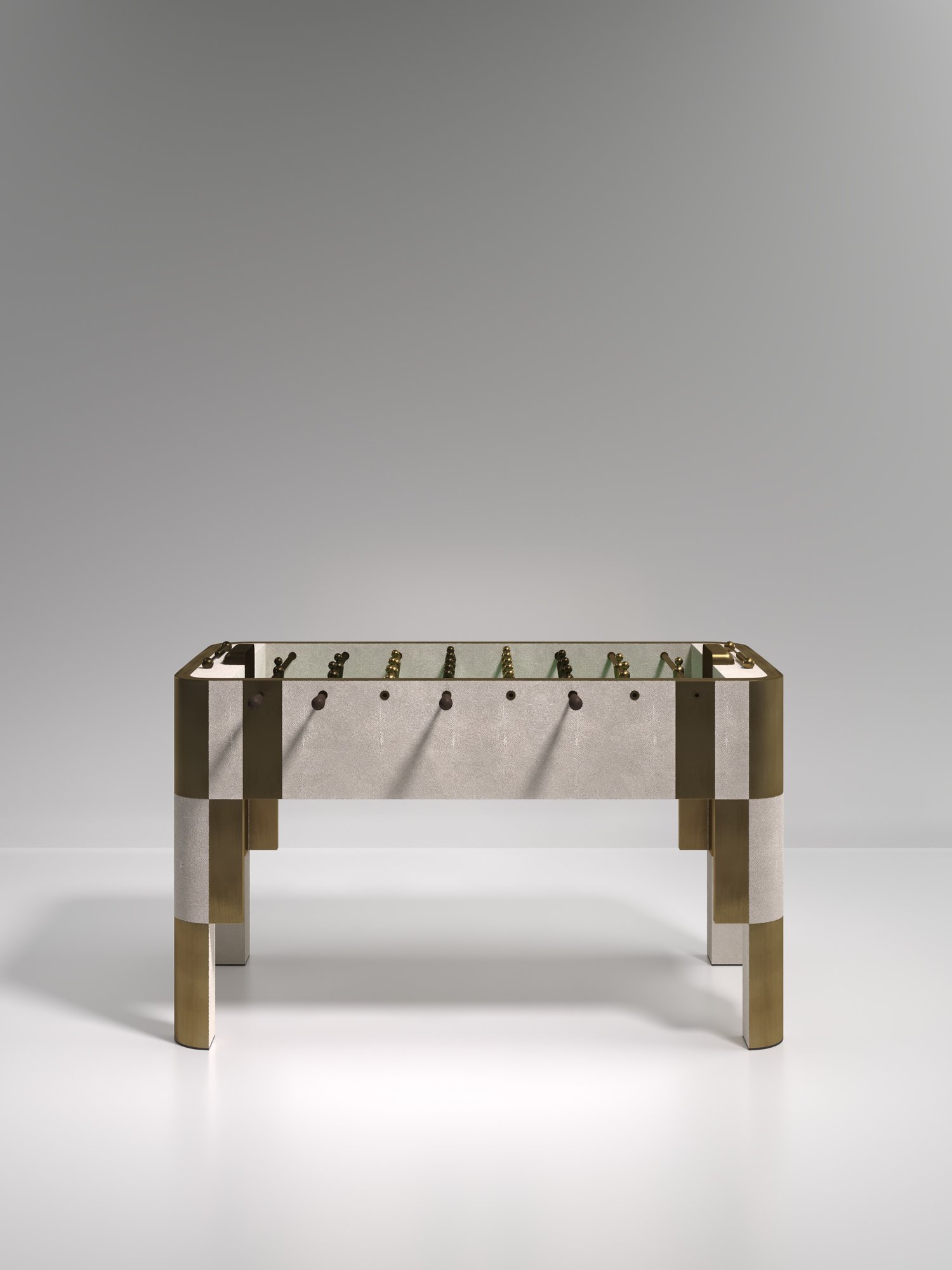 The Damier Foosball Table by R&Y Augousti is a truly luxurious statement piece for your home. The retro-feel of the piece with the checkerboard inspired pattern mix of cream shagreen and bronze-patina brass creates the ultimate luxury game table. The foosball pieces are all in brass and inner table in a green velvet felt. Available in other finishes and variations
