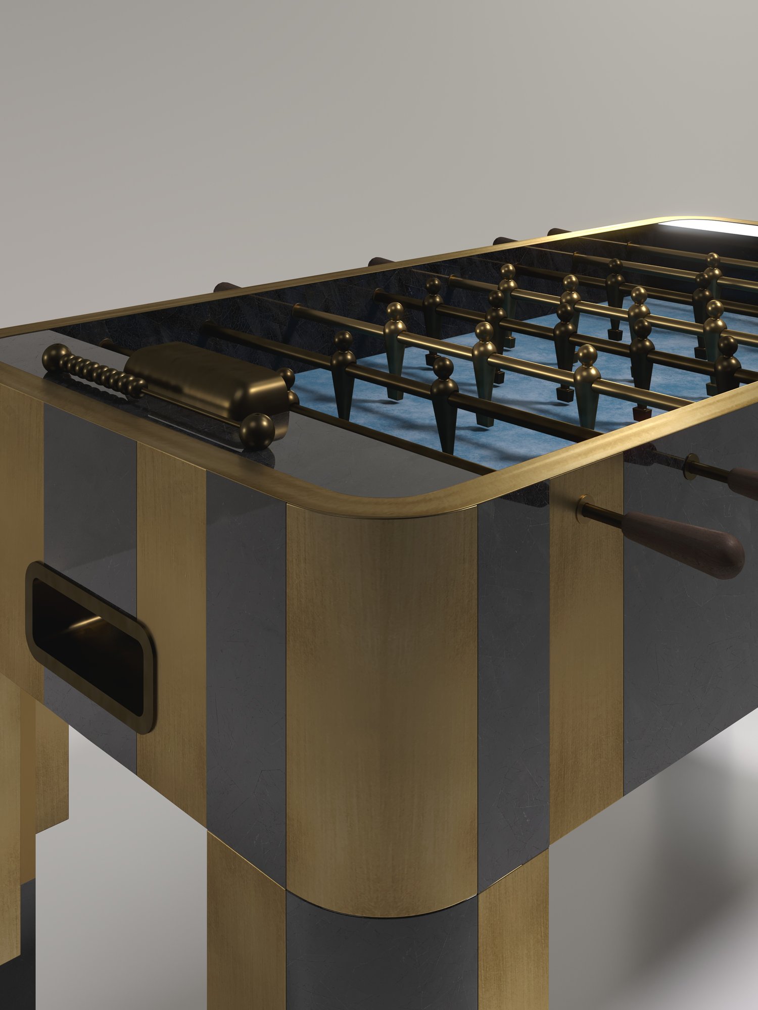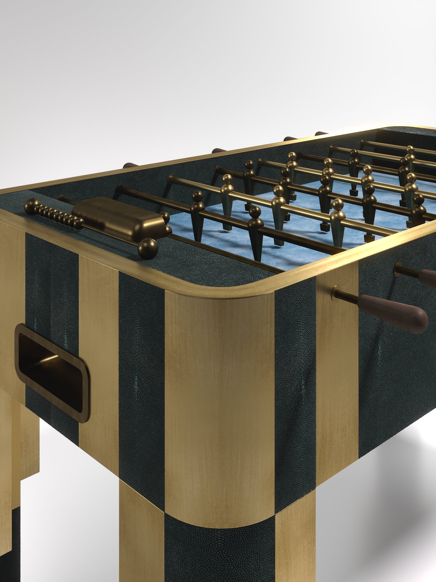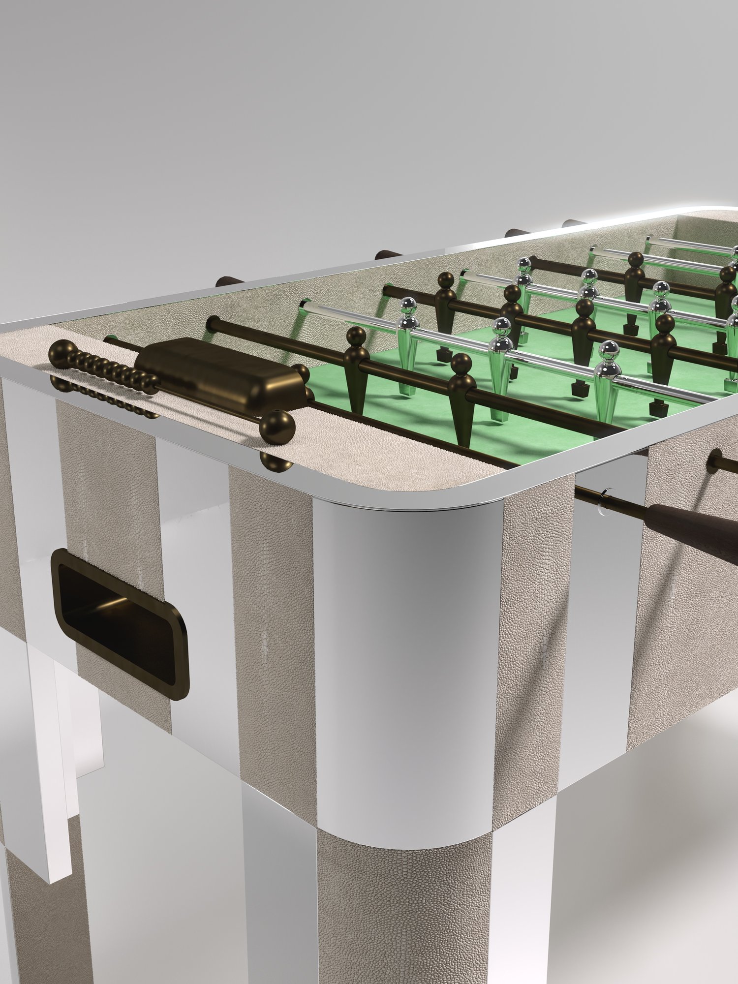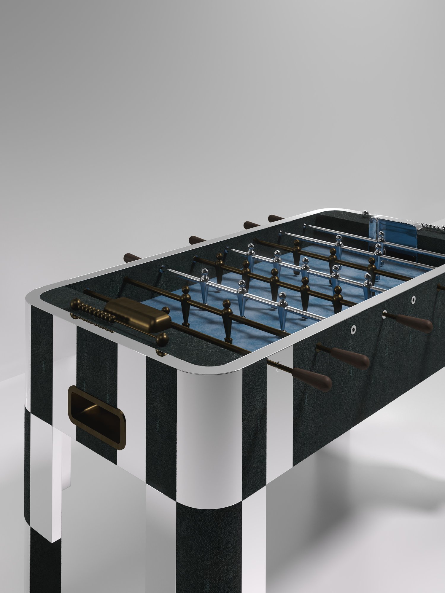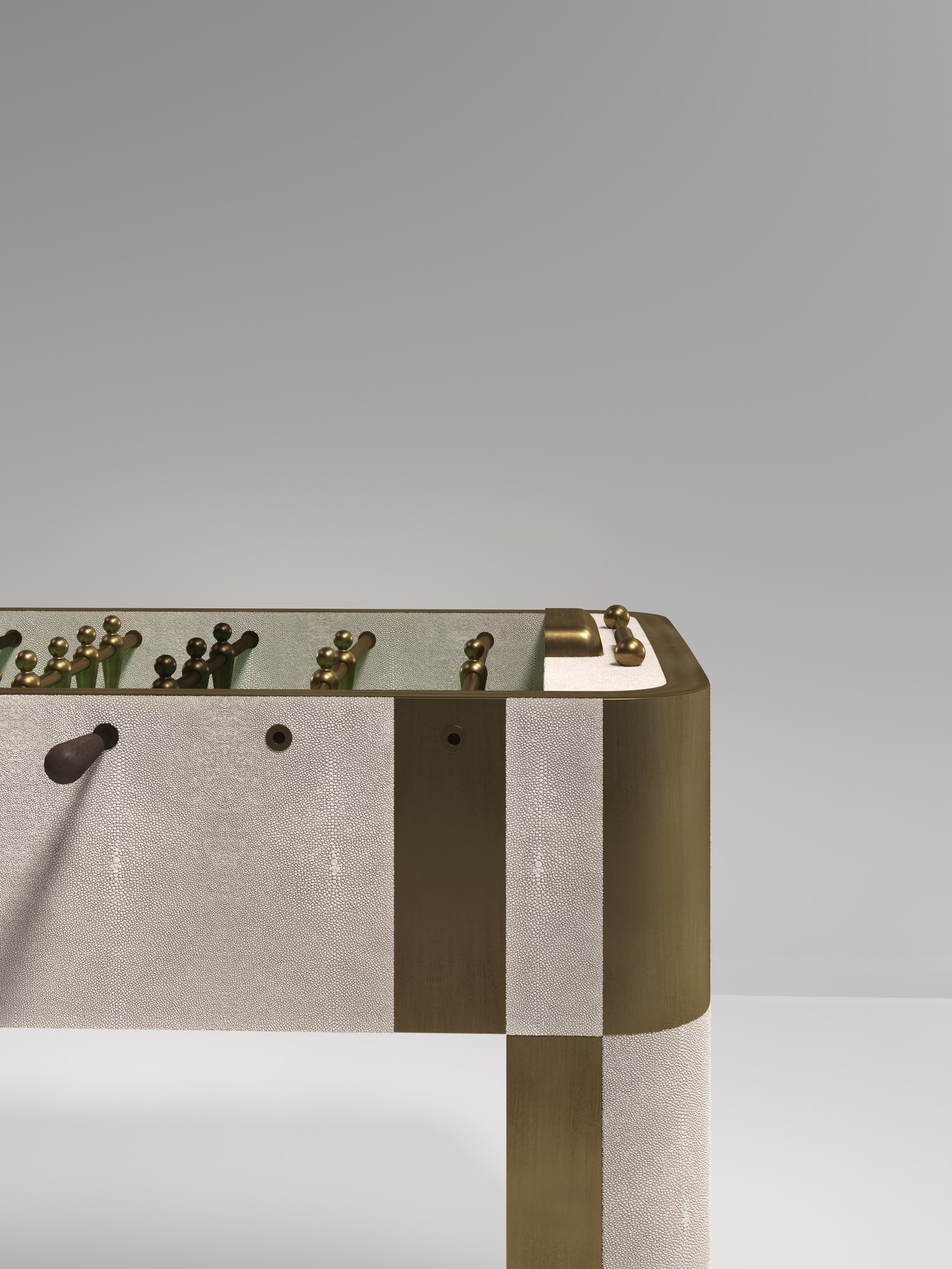 The Damier Foosball Table by R&Y Augousti is a truly luxurious statement piece for your home. The retro-feel of the piece with the checkerboard inspired pattern mix of cream shagreen and bronze-patina brass creates the ultimate luxury game table. The foosball pieces are all in brass and inner table in a green velvet felt. Available in other finishes and variations