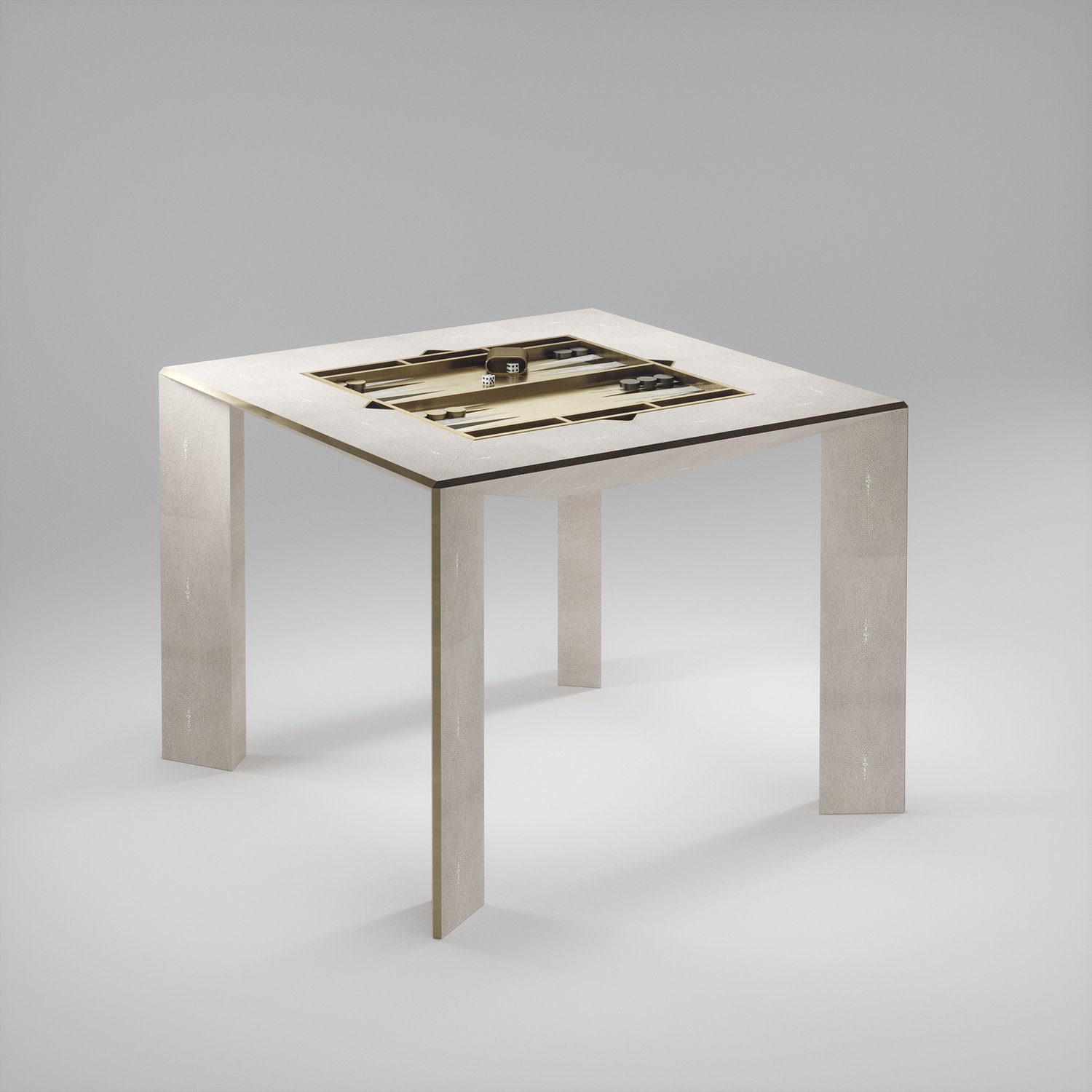 The 4 in 1 Parsons game table R&Y Augousti is a truly luxurious statement piece for your home. The clean lines of the overall piece in cream shagreen, accentuated by the sleek bronze-patina brass details on the legs make it versatile for any space. This piece includes a complete game package set with interchangeable boards that stack on top of each other in the centre of the table; one for chess, one for backgammon, a green velvet bard to play your favourite card games and a plain shagreen board if one were to use it as a beautiful centre piece.