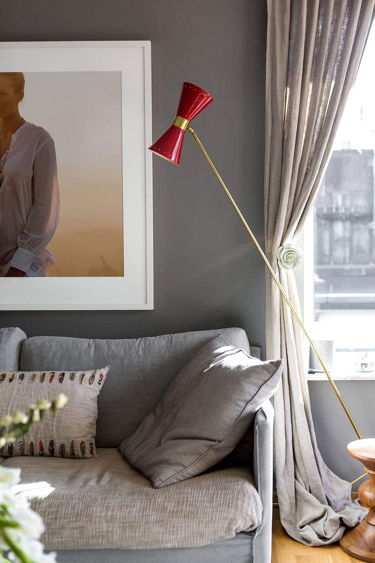 臥室里懸掛的巨幅畫作,或金或紅的落地臺(tái)燈,灰色的毛絨沙發(fā)等等極具標(biāo)志性的室內(nèi)物件,讓房間顯得無比精致而又極具誘惑力。寢具的大膽用色,與臥室整體的中性色調(diào)形成鮮明對比,讓你在這個(gè)灰色空間中,感受到無比的平靜。