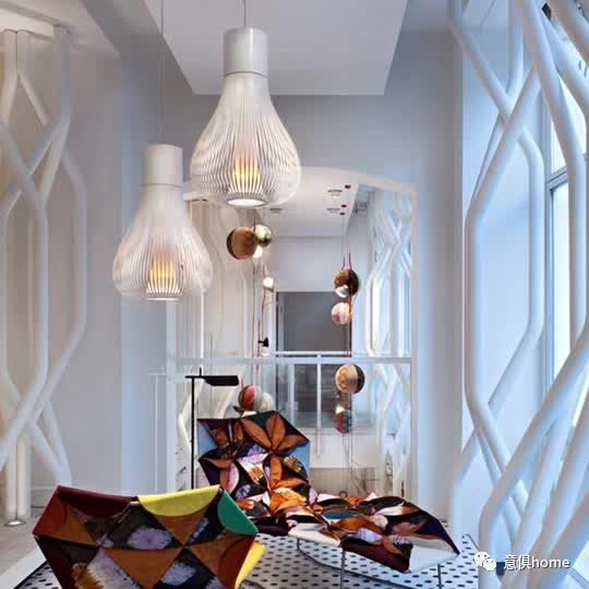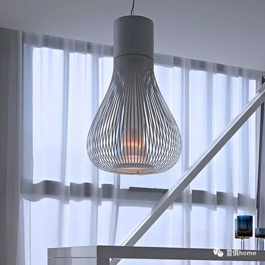 ZEPPELIN系列,外觀酷似傳統帶有金屬臂的吊燈,這是一種柔軟的玻璃樹脂產品,里面數盞小燈被包裹著,同蜘蛛織出的網一樣精巧透明,似蟬蛹、煙霧。